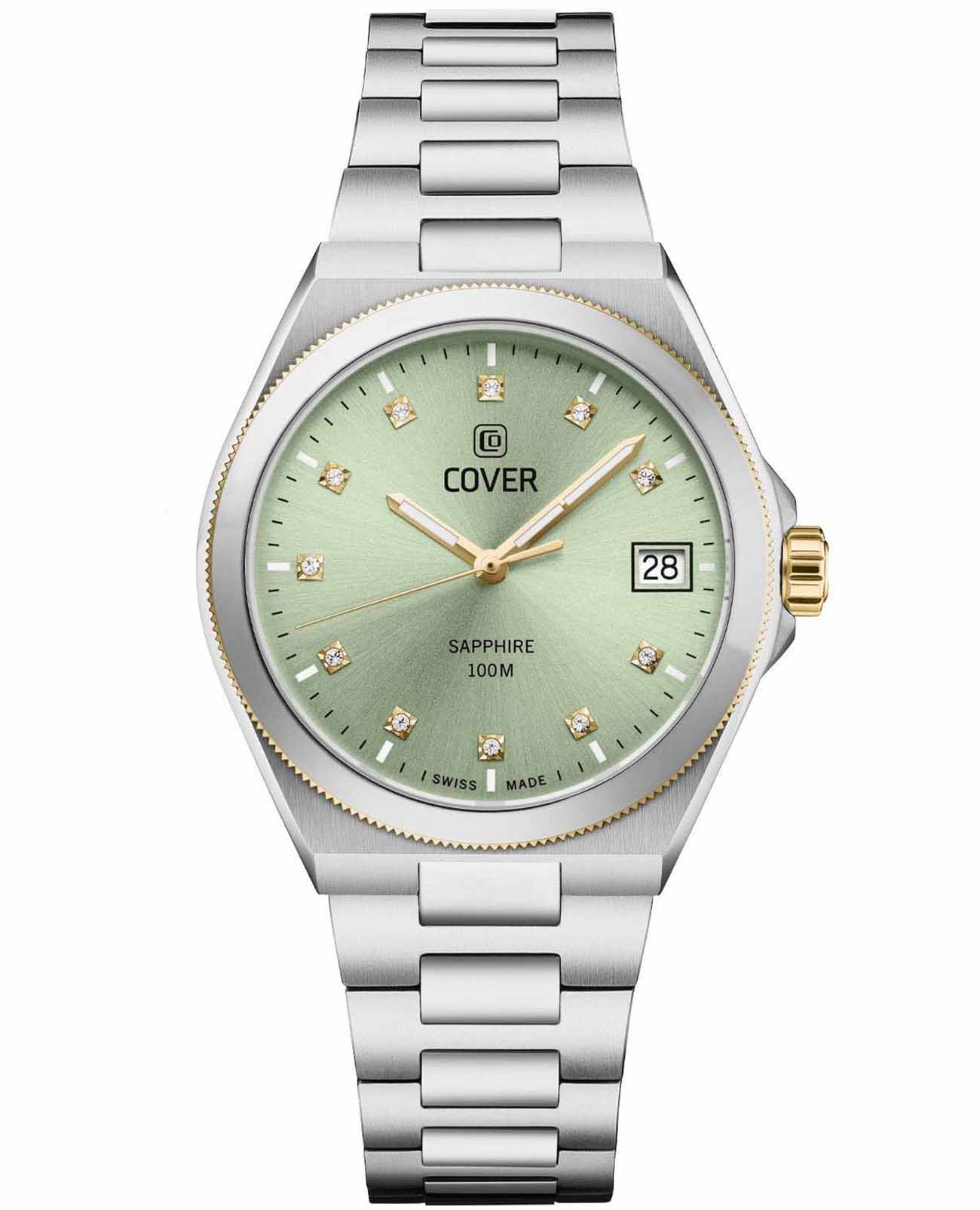 Часы Cover Iconosteel Lady CO223.04 воплощают в себе вечную элегантность благодаря своему чистому и утонченному дизайну. Эти швейцарские часы изготовлен из полированной нержавеющей стали, включая корпус и браслет. Они выделяются светящимся зеленым циферблатом выполненным по технике Sunray, обрамленным характерной формой Iconosteel с круглым корпусом и рифлёным безелемБезельВнешний ободок, закрепляющий стекло. В спортивных часах так называется поворотное кольцо с делениями на циферблате, выполняет роль таймера – замеряет отрезки времени на шкале. Неподвижный безель – элемент декора. Однонаправленно вращающийся безель на дайверских часах позволяет фиксировать моменты погружения и выныривания на поверхность. с частичным золотистым PVD-покрытиемPVDУльтратонкое покрытие наносится в технике вакуумного напыления, сочетает в себе нитрид титана особой прочности со слоем золота или оксида хрома. Несёт в себе декоративную или защитную функцию.. Часовые метки из кристаллов придают циферблату едва заметное сияние, а светящиеся стрелки благодаря люминесцентному покрытиюЛюминесцентное покрытиеПозволяет считывать показания времени в темноте. Производители наносят на стрелки, часовые индексы, безель или поверхность циферблата светонакопительный состав, дающий холодное свечение. обеспечивают отличную читаемость и практичность. Эти швейцарские женские часы, идеально подходящие как для делового стиля, так и для повседневного образа, воплощают в себе универсальность и утонченность. Оснащенные устойчивым к царапинам сапфировым стекломСапфировое стеклоПрочный и надёжный материал из кристалла сапфира синтетического происхождения, характеризующийся особой твёрдостью и устойчивостью к царапинам и повреждениям., швейцарским кварцевым механизмом и функцией отображения даты, эти часы соединяют надежность и элегантность. Завершает образ стальной браслет с раскладной застёжкойРаскладная застёжкаТакой тип застёжки используется только на браслетах из металла. Она никогда не раскрывается полностью, происходит разделение на 2 и более частей. Раскладывающая застёжка снизит вероятность потери часов к минимуму., который удобно сидит на запястье и обеспечивает надежную фиксацию. Часы обладают водозащитой уровня 100WR, что делает их подходящими для повседневного использования и активного образа жизни.