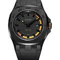 Мужские часы D1 Milano DTRJ03 из коллекции Delta 001 - воплощение современной мужественности. Часы с кварцевым механизмом Miyota GM17 имеют стальной корпус с черным PVD-покрытиемPVDУльтратонкое покрытие наносится в технике вакуумного напыления, сочетает в себе нитрид титана особой прочности со слоем золота или оксида хрома. Несёт в себе декоративную или защитную функцию., диаметром 41,5 мм и толщиной 8,7 мм. Циферблат черно-оранжевый с пескоструйной обработкой, с метками в виде штрихов. Окошко даты в положении 3 часа. Циферблат покрыт сапфировым стекломСапфировое стеклоПрочный и надёжный материал из кристалла сапфира синтетического происхождения, характеризующийся особой твёрдостью и устойчивостью к царапинам и повреждениям. с антибликовым покрытием. Водозащита часов - 50 метров (50WR) - позволит защитить корпус от случайных брызг или капель дождя. Задняя стальная крышка часов крепится на 4 винтах. Удобный каучуковый ремешок с классической застежкой завершает дизайн часов.