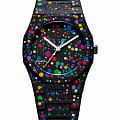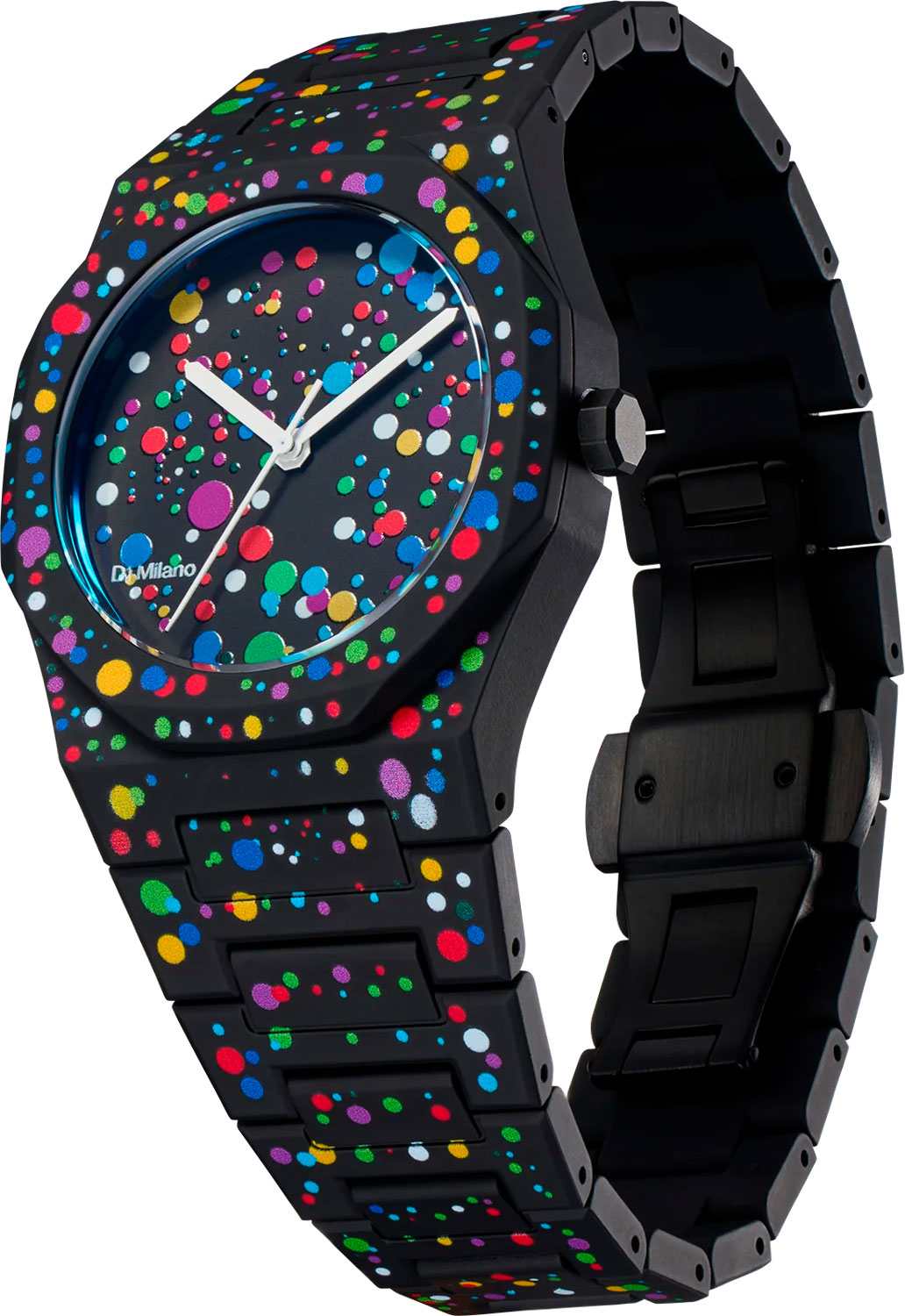 Часы D1 Milano Polycarbon PCBU11 – молодежные часы в стиле унисекс для повседневных образов, стильные и комфортные. Модель Poly Dot имеет черные с цветными брызгами корпус и браслет из поликарбоната с покрытием Софт-Тач. Циферблат лаконичный, защищен минеральным стекломМинеральное стеклоМинеральное стекло представляет собой искусственно выращенный минерал кварца. Такое стекло отличается особой устойчивостью к повреждениям и царапинам. Уступает по некоторым качествам сапфировому стеклу. с антибликовым покрытием. Стальная задняя крышка на 4 винтах. Пластиковый браслет на застёжке-бабочке с кнопкамиЗастёжка "бабочка"Такой вид застёжки дополняется предохранителями, помогающими избежать случайного раскрытия браслета. Обладают изящным исполнением. .
