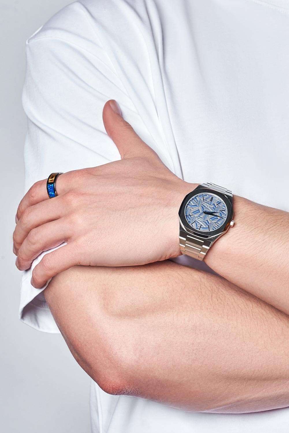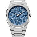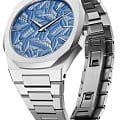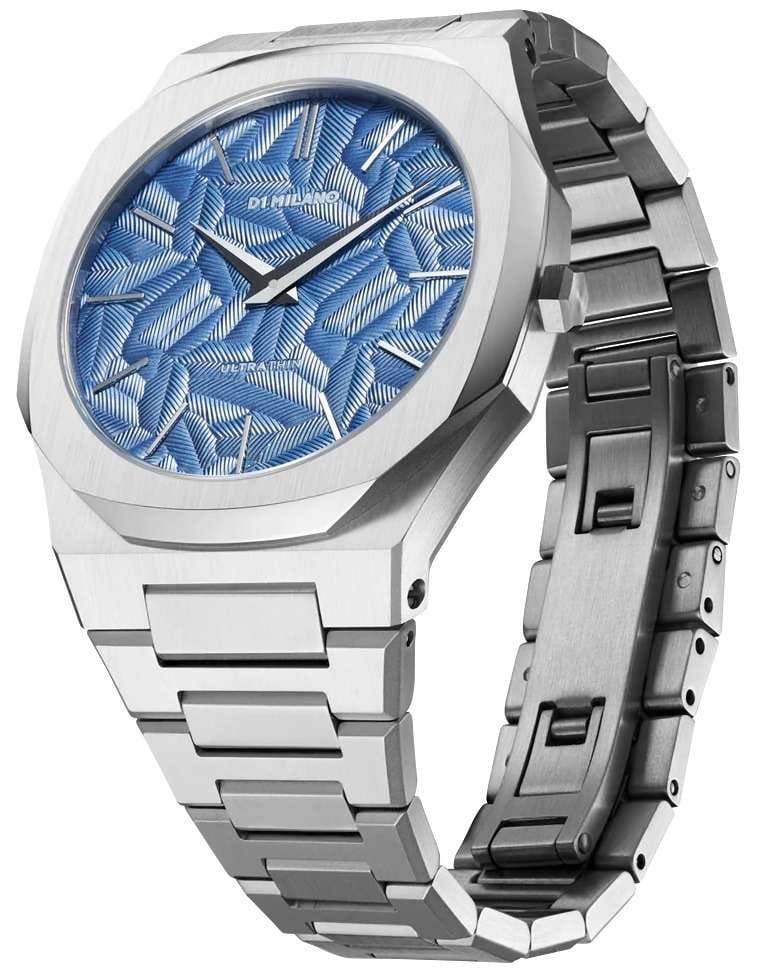 Часы D1 Milano UTBJ35 — это уникальные кварцевые часы, которые подчеркнут ваш изысканный стиль. Эти наручные часы из коллекции Ultra Thin с эффектным монохромным дизайном станут выразительным акцентом вашего образа. Корпус диаметром 40 мм из нержавеющей стали придает часам современный и утонченный вид. Циферблат синего цвета выполнен в виде фигурного узора, напоминающего листья, а серебристые хроматические стрелки и индексы создают стильный контраст, подчёркивая элегантность модели. Задняя крышка из нержавеющей стали закреплена на 8-х винтах и дополнена индивидуальным серийным номером, что подчеркивает уникальность каждого экземпляра. Стальной браслет с раскладной застёжкойРаскладная застёжкаТакой тип застёжки используется только на браслетах из металла. Она никогда не раскрывается полностью, происходит разделение на 2 и более частей. Раскладывающая застёжка снизит вероятность потери часов к минимуму. обеспечивает надежность и комфорт в повседневном использовании. Сапфировое стеклоСапфировое стеклоПрочный и надёжный материал из кристалла сапфира синтетического происхождения, характеризующийся особой твёрдостью и устойчивостью к царапинам и повреждениям. с антибликовым покрытием защищает циферблат, а водозащита до 50WR делает эти часы практичным выбором для любых условий. Благодаря калибру Miyota GL24, они отличаются точностью и надежностью. Эти итальянские часы представляют собой идеальное сочетание традиционного мастерства и инновационного подхода, воплощая в себе новый взгляд на классическую элегантность.