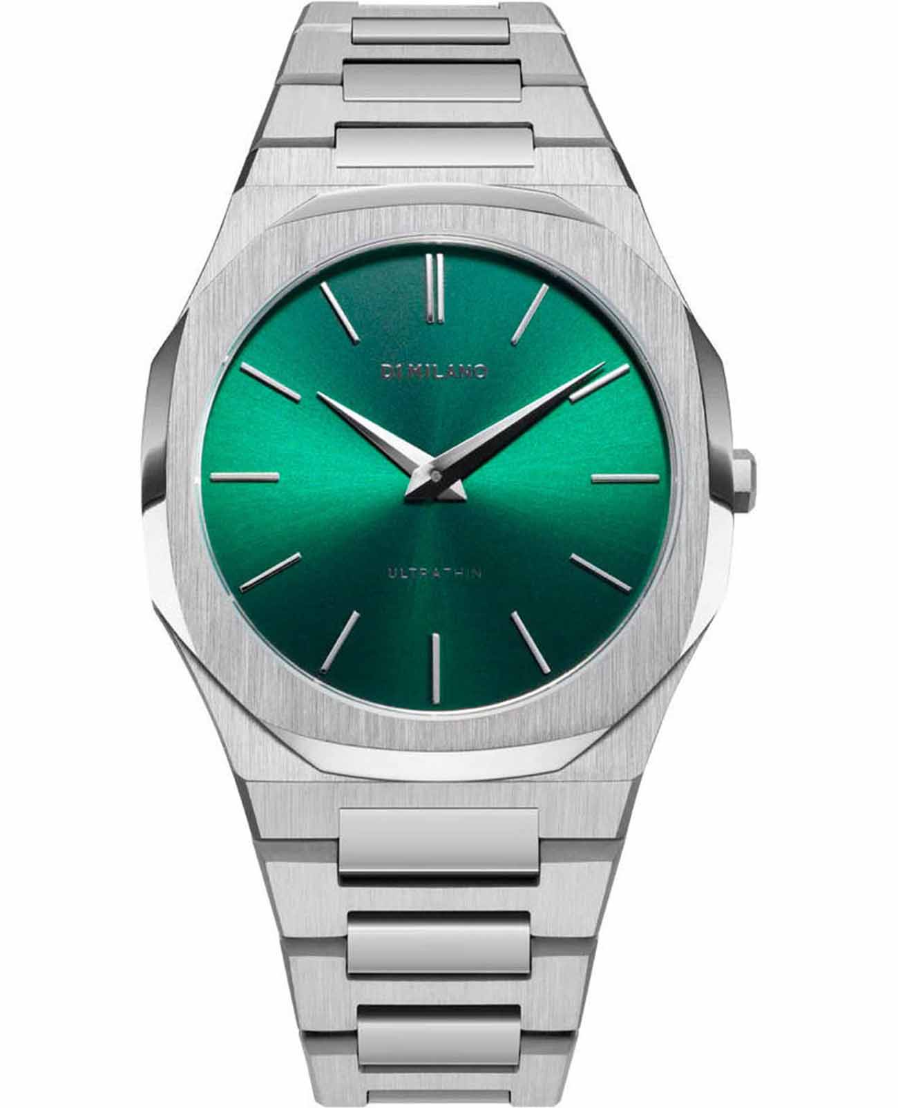 Часы D1 Milano UTBJ37 — это уникальные кварцевые часы, которые подчеркнут ваш изысканный стиль. Эти наручные часы из коллекции Ultra Thin с эффектным монохромным дизайном станут выразительным акцентом вашего образа. Корпус диаметром 40 мм из нержавеющей стали придает часам современный и утонченный вид. Зеленый циферблат метками в виде штрихов, а серебристые хроматические стрелки и индексы создают стильный контраст, подчёркивая элегантность модели. Задняя крышка из нержавеющей стали закреплена на 8-х винтах и дополнена индивидуальным серийным номером, что подчеркивает уникальность каждого экземпляра. Стальной браслет с раскладной застёжкойРаскладная застёжкаТакой тип застёжки используется только на браслетах из металла. Она никогда не раскрывается полностью, происходит разделение на 2 и более частей. Раскладывающая застёжка снизит вероятность потери часов к минимуму. обеспечивает надежность и комфорт в повседневном использовании. Сапфировое стеклоСапфировое стеклоПрочный и надёжный материал из кристалла сапфира синтетического происхождения, характеризующийся особой твёрдостью и устойчивостью к царапинам и повреждениям. с антибликовым покрытием защищает циферблат, а водозащита до 50WR делает эти часы практичным выбором для любых условий. Благодаря калибру Miyota 1L22, они отличаются точностью и надежностью. Эти итальянские часы представляют собой идеальное сочетание традиционного мастерства и инновационного подхода, воплощая в себе новый взгляд на классическую элегантность.