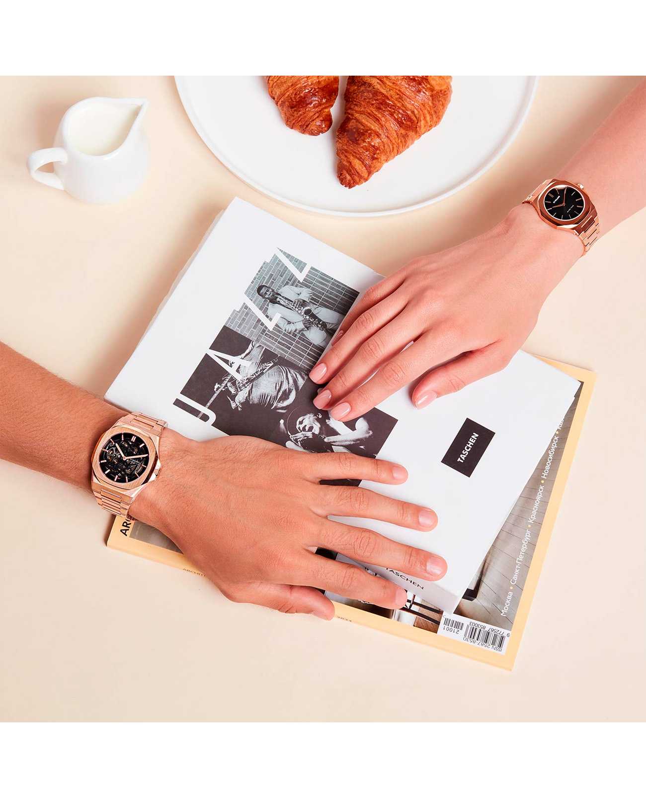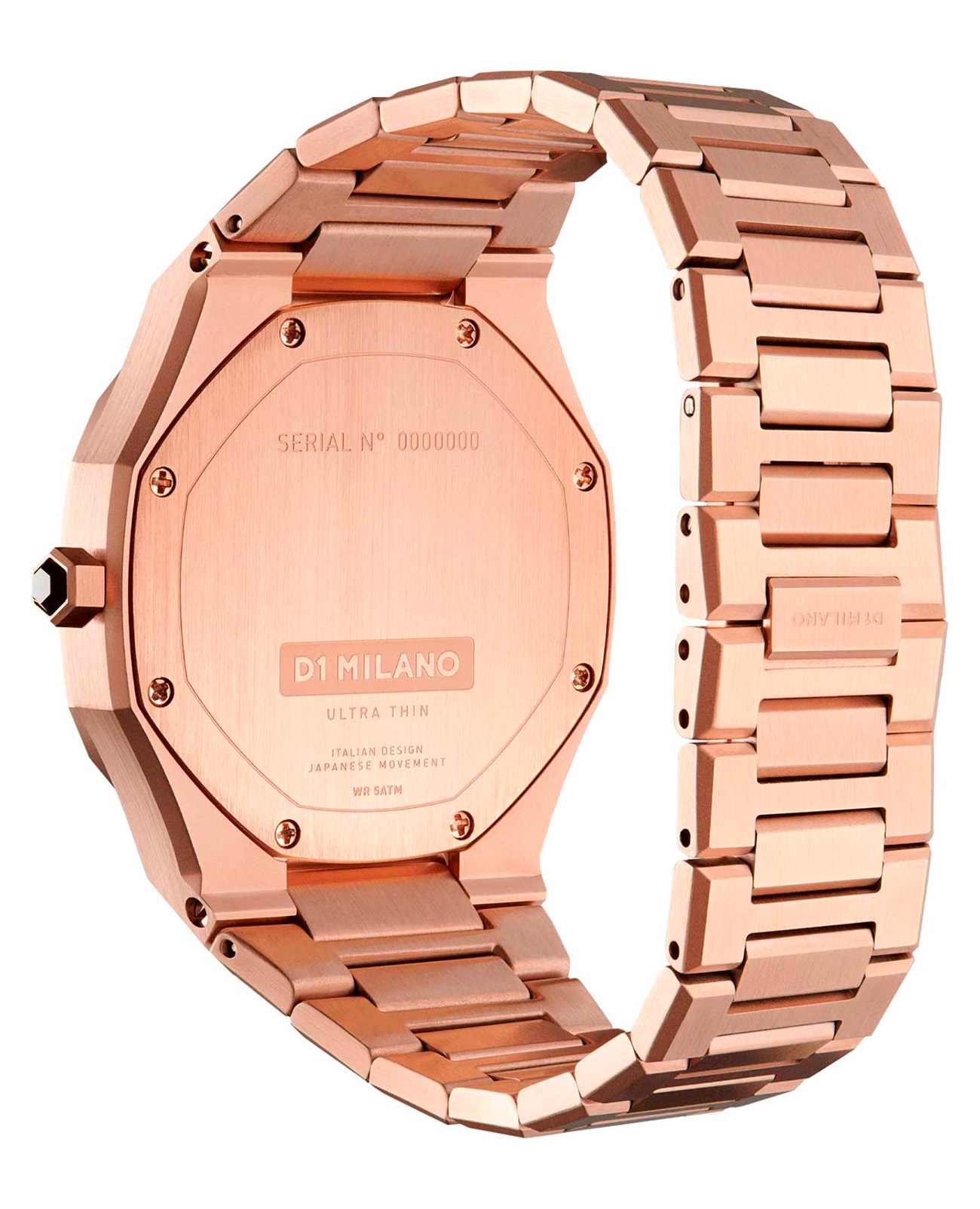 Женские наручные часы D1 Milano UTBL06 из коллекции Ultra Thin сочетают в себе элегантный дизайн и современные технологии. Модель обладает круглым корпусом диаметром 34 мм, изготовленным из нержавеющей стали с PVD-покрытиемPVDУльтратонкое покрытие наносится в технике вакуумного напыления, сочетает в себе нитрид титана особой прочности со слоем золота или оксида хрома. Несёт в себе декоративную или защитную функцию. в розовом золоте, что обеспечивает устойчивость к внешним воздействиям. Толщина ультратонкого корпуса составляет всего 6 мм, делая аксессуар легким и удобным для повседневного использования. Браслет также выполнен из того же материала с раскладной застежкойРаскладной замокДанный вариант застежки используется только на часах с металлическим браслетом. Отличительная особенность такого крепления в том, что длина браслета становится универсальной и вы можете самостоятельно отрегулировать нужный вам размер – застежка просто двигается по браслету часов., гарантирующей комфортное ношение и безопасность. Черный циферблат украшен метками в виде штрихов и оснащен стрелочным механизмом в тон корпуса, который подчеркивает элегантность модели. Для защиты используется сапфировое стеклоСапфировое стеклоПрочный и надёжный материал из кристалла сапфира синтетического происхождения, характеризующийся особой твёрдостью и устойчивостью к царапинам и повреждениям., обеспечивающее прочную защиту от царапин и бликов. Часы работают на кварцевом механизме, гарантирующем точность хода без необходимости регулярного подзавода. Водонепроницаемость часов достигает 5 атмосфер (50 метров), что позволяет использовать их во время мытья рук или плавания, однако не рекомендуется для глубоководного дайвинга.