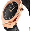 Мужские наручные часы из коллекции Ultra Thin сочетают в себе современный дизайн и надежность технологий. Модель обладает круглым корпусом диаметром 40 мм, выполненным из высококачественной нержавеющей стали с PVD-покрытиемPVDУльтратонкое покрытие наносится в технике вакуумного напыления, сочетает в себе нитрид титана особой прочности со слоем золота или оксида хрома. Несёт в себе декоративную или защитную функцию. под розовое золото, что обеспечивает устойчивость к внешним воздействиям и придает изделию элегантный вид. Толщина корпуса составляет всего 6 мм, что делает часы ультратонкими и комфортными для повседневного использования. Черный циферблат украшен деталями в оттенке розового золота, создавая гармоничный и стильный образ. Защиту циферблата обеспечивает сапфировое стеклоСапфировое стеклоПрочный и надёжный материал из кристалла сапфира синтетического происхождения, характеризующийся особой твёрдостью и устойчивостью к царапинам и повреждениям., известное своей устойчивостью к царапинам и высокой прозрачностью. Часы оснащены кварцевым механизмом, гарантирующим точность хода без необходимости подзаводки. Ремешок выполнен из натуральной кожи, что обеспечивает комфортное ношение на протяжении всего дня. Водонепроницаемость модели составляет 5 атмосфер (50 метров), что позволяет использовать часы в повседневной жизни, включая контакт с водой при мытье рук или дожде, однако не рекомендуется для погружений или активных водных видов спорта. Изготовленные в Италии, эти часы станут стильным аксессуаром, идеально дополняющим как деловой, так и casual-образ.