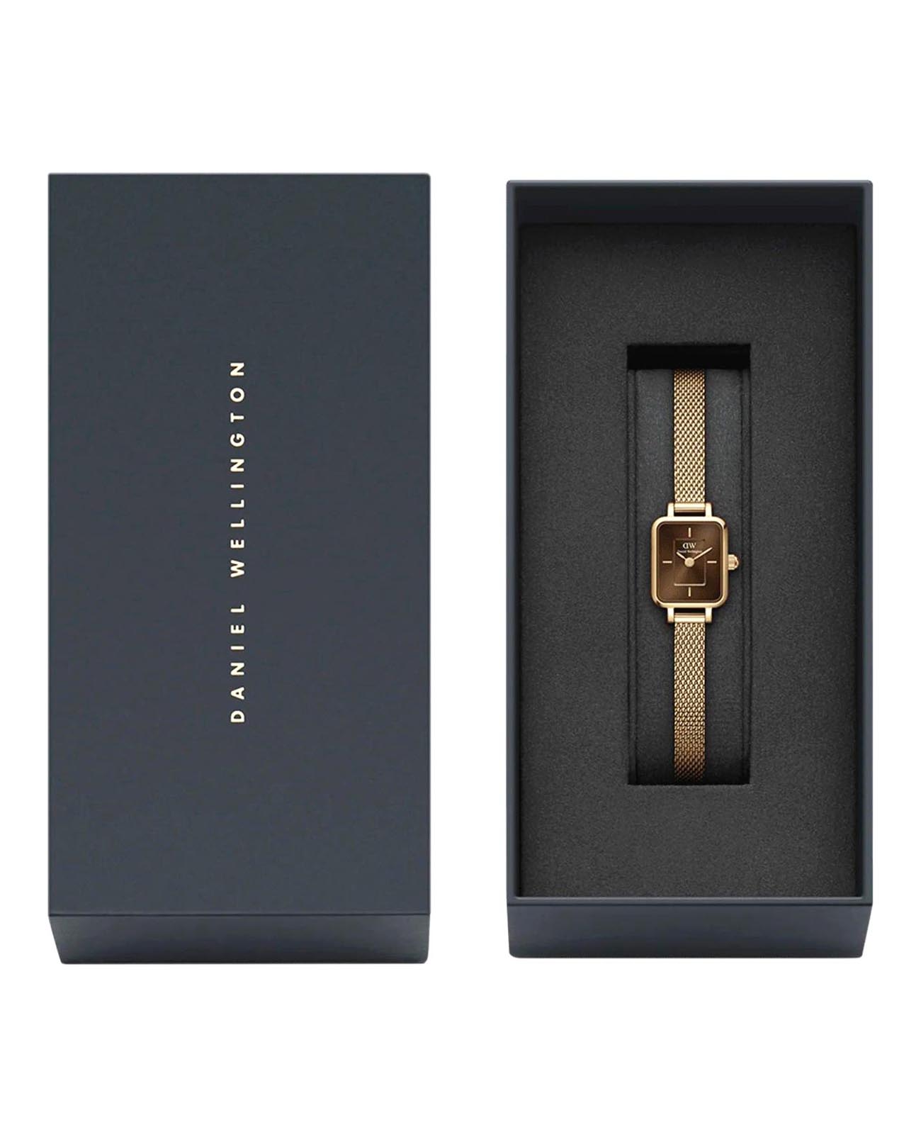 Женские наручные часы с минеральным стекломМинеральное стеклоМинеральное стекло представляет собой искусственно выращенный минерал кварца. Такое стекло отличается особой устойчивостью к повреждениям и царапинам. Уступает по некоторым качествам сапфировому стеклу. Daniel Wellington Quadro DW00100654, кварцевый механизм с высокой точностью. Корпус часов изготовлен из стали с PVD-покрытиемPVDУльтратонкое покрытие наносится в технике вакуумного напыления, сочетает в себе нитрид титана особой прочности со слоем золота или оксида хрома. Несёт в себе декоративную или защитную функцию.. Двухуровневый циферблат выполнен по технологии Sunray (солнечные лучи) и украшен фирменным логотипом Daniel Wellington. Накладные метки в виде штрихов. Рифленая заводная головка. Индивидуальный серийный номер. Класс водозащиты: 30 метров, позволит защитить корпус от случайных брызг или капель дождя. Стальной браслет миланского плетения с PVD-покрытиемPVDУльтратонкое покрытие наносится в технике вакуумного напыления, сочетает в себе нитрид титана особой прочности со слоем золота или оксида хрома. Несёт в себе декоративную или защитную функцию. на раскладном замкеРаскладной замокДанный вариант застежки используется только на часах с металлическим браслетом. Отличительная особенность такого крепления в том, что длина браслета становится универсальной и вы можете самостоятельно отрегулировать нужный вам размер – застежка просто двигается по браслету часов..