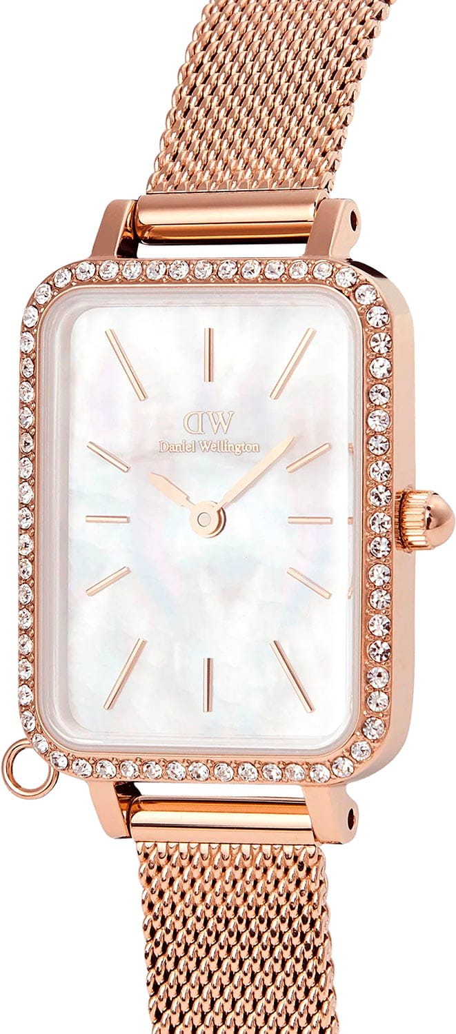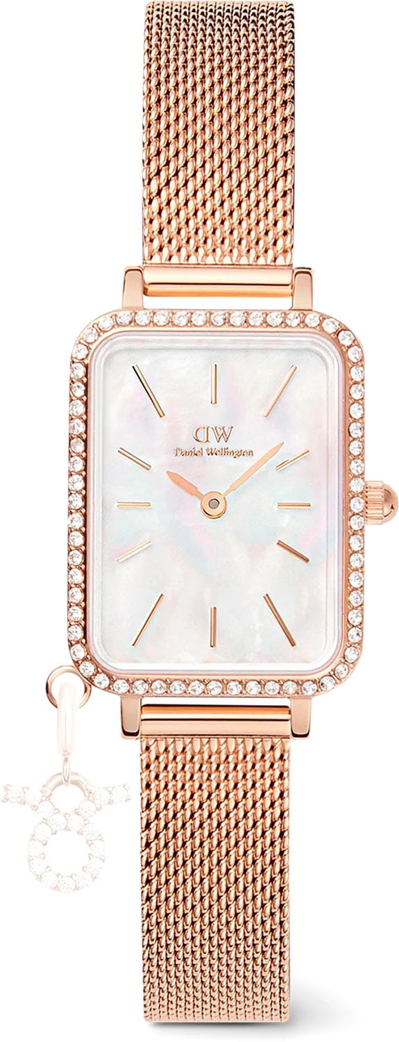 Женские наручные часы с минеральным стекломМинеральное стеклоМинеральное стекло представляет собой искусственно выращенный минерал кварца. Такое стекло отличается особой устойчивостью к повреждениям и царапинам. Уступает по некоторым качествам сапфировому стеклу. Daniel Wellington Quadro Crystal Zodiac Melrose DW00100748, кварцевый механизм с высокой точностью. Корпус часов изготовлен из нержавеющей стали с PVD-покрытиемPVDУльтратонкое покрытие наносится в технике вакуумного напыления, сочетает в себе нитрид титана особой прочности со слоем золота или оксида хрома. Несёт в себе декоративную или защитную функцию.. БезельБезельВнешний ободок, закрепляющий стекло. В спортивных часах так называется поворотное кольцо с делениями на циферблате, выполняет роль таймера – замеряет отрезки времени на шкале. Неподвижный безель – элемент декора. Однонаправленно вращающийся безель на дайверских часах позволяет фиксировать моменты погружения и выныривания на поверхность. украшен кристаллами Swarovski. Матовый циферблат украшен фирменным логотипом Daniel Wellington. Накладные метки в виде штрихов. Японский кварцевый механизм. Рифленая заводная головка. Класс водозащиты: 30 метров, позволит защитить корпус от случайных брызг или капель дождя. Стальной браслет миланского плетения с PVD-покрытиемPVDУльтратонкое покрытие наносится в технике вакуумного напыления, сочетает в себе нитрид титана особой прочности со слоем золота или оксида хрома. Несёт в себе декоративную или защитную функцию. на раскладном замкеРаскладной замокДанный вариант застежки используется только на часах с металлическим браслетом. Отличительная особенность такого крепления в том, что длина браслета становится универсальной и вы можете самостоятельно отрегулировать нужный вам размер – застежка просто двигается по браслету часов.. Корпус дополнен колечком для подвески.