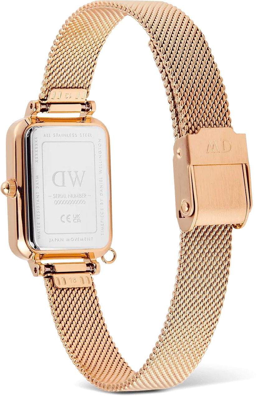 Женские наручные часы с минеральным стекломМинеральное стеклоМинеральное стекло представляет собой искусственно выращенный минерал кварца. Такое стекло отличается особой устойчивостью к повреждениям и царапинам. Уступает по некоторым качествам сапфировому стеклу. Daniel Wellington Quadro Crystal Zodiac Evergold DW00100749, кварцевый механизм с высокой точностью. Корпус часов изготовлен из нержавеющей стали с PVD-покрытиемPVDУльтратонкое покрытие наносится в технике вакуумного напыления, сочетает в себе нитрид титана особой прочности со слоем золота или оксида хрома. Несёт в себе декоративную или защитную функцию.. БезельБезельВнешний ободок, закрепляющий стекло. В спортивных часах так называется поворотное кольцо с делениями на циферблате, выполняет роль таймера – замеряет отрезки времени на шкале. Неподвижный безель – элемент декора. Однонаправленно вращающийся безель на дайверских часах позволяет фиксировать моменты погружения и выныривания на поверхность. украшен кристаллами Swarovski. Матовый циферблат украшен фирменным логотипом Daniel Wellington. Накладные метки в виде штрихов. Японский кварцевый механизм. Рифленая заводная головка. Класс водозащиты: 30 метров, позволит защитить корпус от случайных брызг или капель дождя. Стальной браслет миланского плетения с PVD-покрытиемPVDУльтратонкое покрытие наносится в технике вакуумного напыления, сочетает в себе нитрид титана особой прочности со слоем золота или оксида хрома. Несёт в себе декоративную или защитную функцию. на раскладном замкеРаскладной замокДанный вариант застежки используется только на часах с металлическим браслетом. Отличительная особенность такого крепления в том, что длина браслета становится универсальной и вы можете самостоятельно отрегулировать нужный вам размер – застежка просто двигается по браслету часов..Корпус дополнен колечком для подвески.