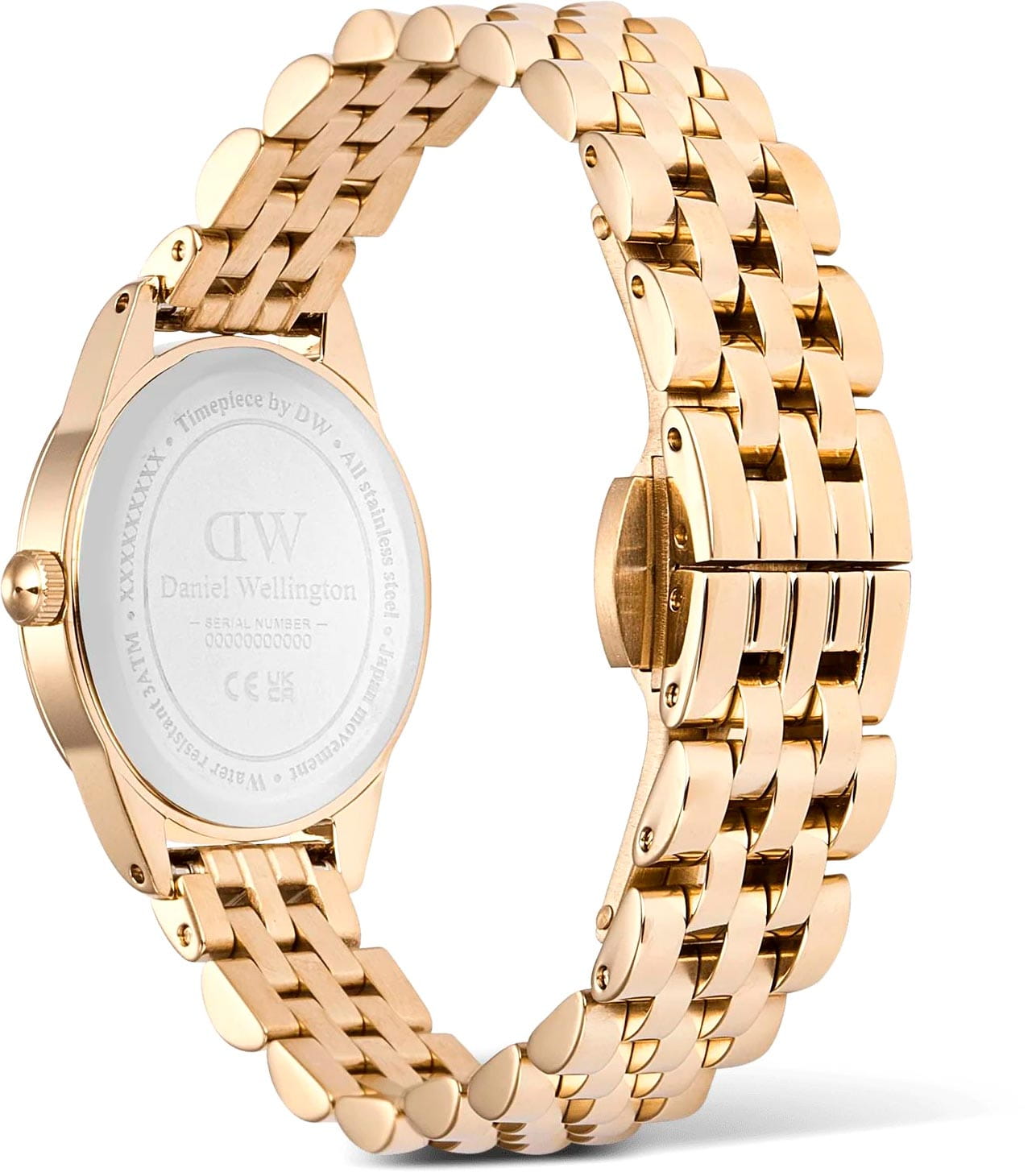 Daniel Wellington Ophelia — женственные часы с овальным корпусом 22 мм из нержавеющей стали с изящным PVDPVDУльтратонкое покрытие наносится в технике вакуумного напыления, сочетает в себе нитрид титана особой прочности со слоем золота или оксида хрома. Несёт в себе декоративную или защитную функцию.-покрытием в цвете золота. Глубокий циферблат с радиальным переливом украшен римскими индексами, что придаёт образу классическую элегантность.