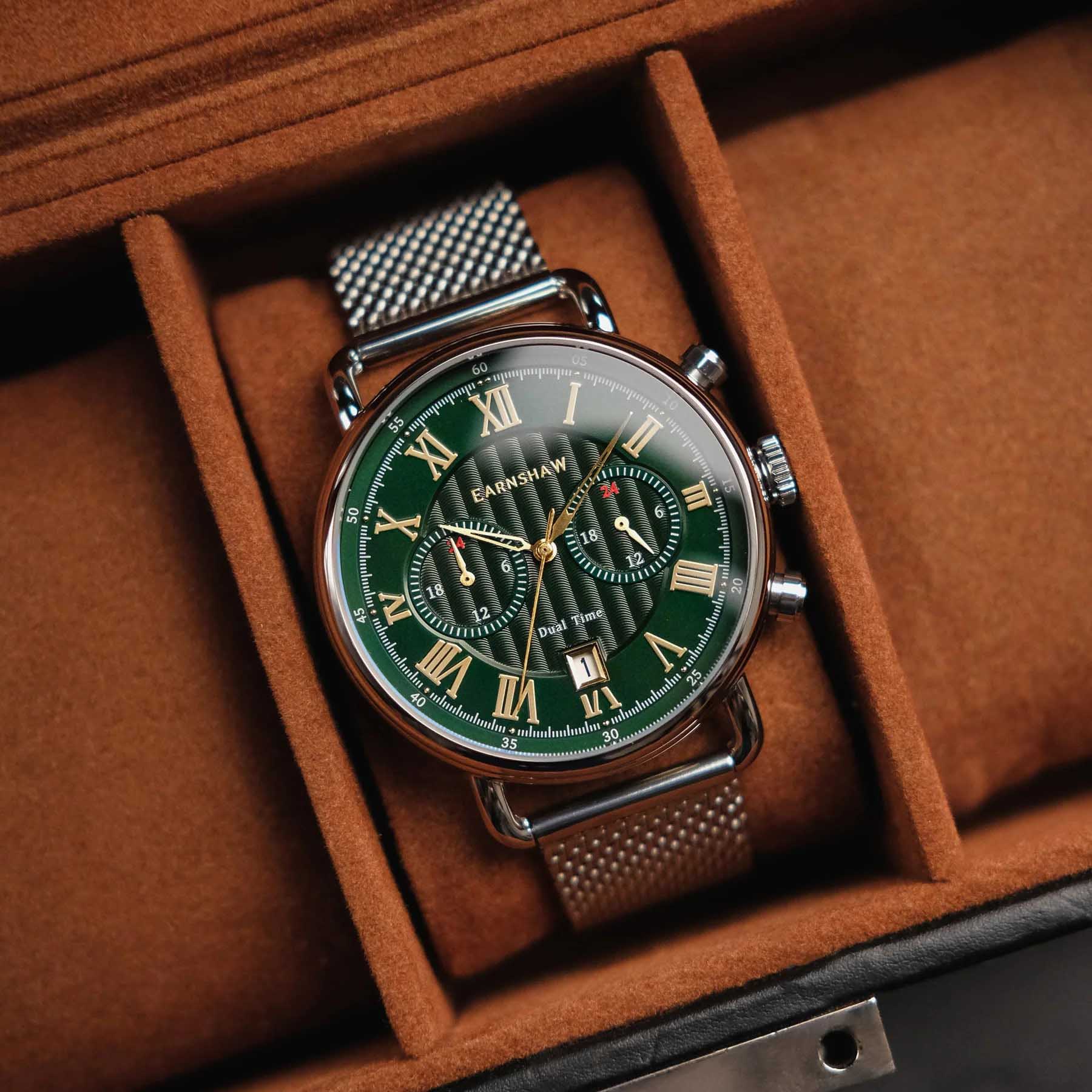 Мужские наручные часы с минеральным стекломМинеральное стеклоМинеральное стекло представляет собой искусственно выращенный минерал кварца. Такое стекло отличается особой устойчивостью к повреждениям и царапинам. Уступает по некоторым качествам сапфировому стеклу. Earnshaw Investigator ES-8194-33, кварцевый механизм с высокой точностью. Класс водозащиты: 50 метров, позволит защитить корпус от случайных брызг или капель дождя. Корпус часов изготовлен из стали. Центральные часовая, минутная и секундная стрелки. Апертура даты в позиции 6 часов. 12/24х часовой формат времени. Второй часовой пояс. Коричневый циферблат. Римская индикация времени. Круглый корпус выполнен из нержавеющей стали.