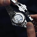 Мужские наручные часы с минеральным стекломМинеральное стеклоМинеральное стекло представляет собой искусственно выращенный минерал кварца. Такое стекло отличается особой устойчивостью к повреждениям и царапинам. Уступает по некоторым качествам сапфировому стеклу. Earnshaw Barallier ES-8242-33, механический механизм с автоподзаводом. Класс водозащиты: 30 метров, позволит защитить корпус от случайных брызг или капель дождя. Скелетонизированный циферблат. Центральные часовая и минутная стрелки. 12/24х часовой формат времени. Индикатор день/ночь. Циферблат с часовыми индексами в виде штрихов и цифр. Корпус выполнен из нержавеющей стали. Диаметр корпуса 42 мм, толщина 15 мм. Раскладная застёжкаРаскладная застёжкаТакой тип застёжки используется только на браслетах из металла. Она никогда не раскрывается полностью, происходит разделение на 2 и более частей. Раскладывающая застёжка снизит вероятность потери часов к минимуму.