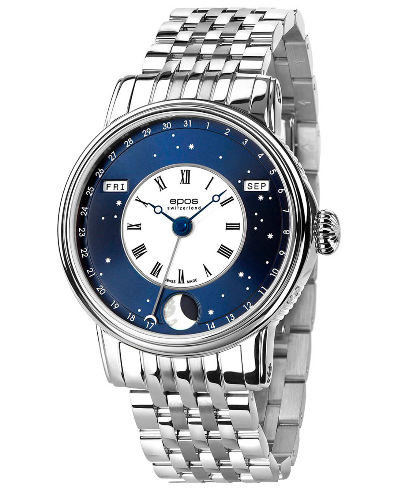 Мужские швейцарские механические часы с автоподзаводом Epos Oeuvre d'art 3439.322.20.26.30. Сапфировое стеклоСапфировое стеклоПрочный и надёжный материал из кристалла сапфира синтетического происхождения, характеризующийся особой твёрдостью и устойчивостью к царапинам и повреждениям. устойчивое к появлению царапин, обладающее высокой прозрачностью. Корпус часов изготовлен из нержавеющей стали. В механизме 25 камней, частота 28800 полуколебаний в час. Запас хода 42 часа. Механизм декорирован узором Cotes de Geneve. Циферблат в виде симбиоза белой лакированной вставки с римскими цифрами и вставки в виде ночного неба, выполненной по технологии Sunray (солнечные лучи). Светящиеся звезды и большая луна с люминесцентной подсветкойЛюминесцентное покрытиеПозволяет считывать показания времени в темноте. Производители наносят на стрелки, часовые индексы, безель или поверхность циферблата светонакопительный состав, дающий холодное свечение.. Дата отображается центральной стрелкой. Окошко дня недели и месяца. Автоматический указатель фазы луны. Винтажная заводная головка. Прозрачная задняя крышка. Класс водозащиты: 50 метров, позволит защитить корпус от случайных брызг или капель дождя. Стальной браслет на раскладной застёжкеРаскладная застёжкаТакой тип застёжки используется только на браслетах из металла. Она никогда не раскрывается полностью, происходит разделение на 2 и более частей. Раскладывающая застёжка снизит вероятность потери часов к минимуму..