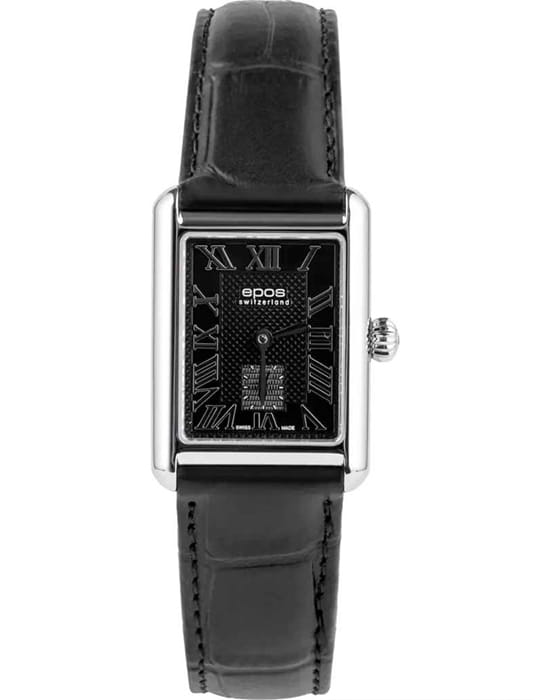 Epos 8002.702.20.25.15 — женская модель с утончённым классическим стилем и прямоугольным корпусом, выполненным из нержавеющей стали. Чёрный циферблат оформлен римскими индексами и утончённым узором «Clous de Paris», создающим игру света и подчёркивающим глубину дизайна. Защитную функцию выполняет сапфировое стеклоСапфировое стеклоПрочный и надёжный материал из кристалла сапфира синтетического происхождения, характеризующийся особой твёрдостью и устойчивостью к царапинам и повреждениям., стойкое к царапинам и сохраняющее прозрачность. В основе лежит швейцарский автоматический механизм, обеспечивающий стабильность и точность хода. Функции включают индикацию часов, минут и малую секундную шкалу, расположенную в позиции «6 часов». Часы дополнены кожаным ремешком классического чёрного цвета, который гармонично завершает строгий образ модели.