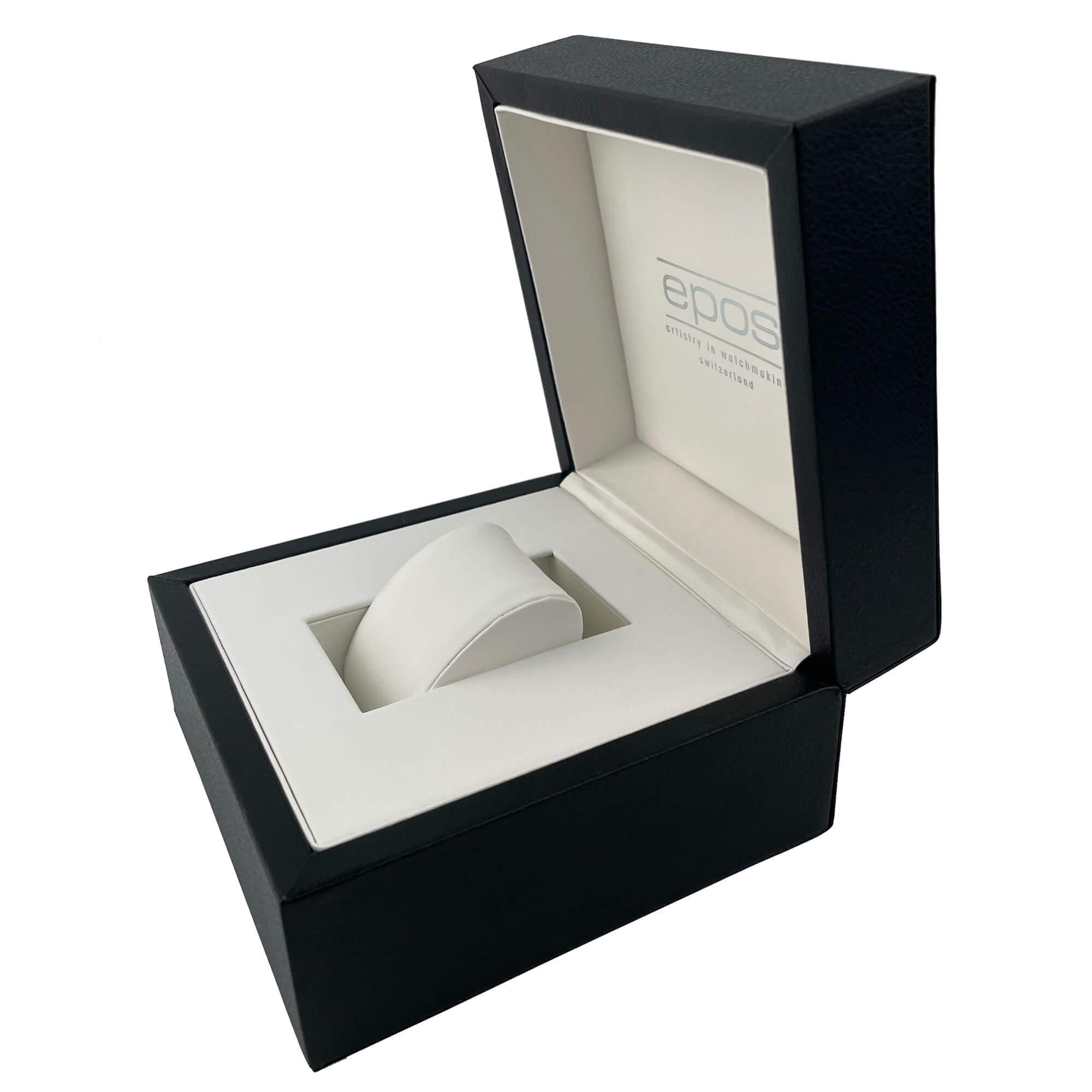 Epos 8002.702.20.85.15 — женская модель с утончённым классическим стилем и прямоугольным корпусом, выполненным из нержавеющей стали. Чёрный циферблат оформлен римскими индексами и утончённым узором «Clous de Paris», создающим игру света и подчёркивающим глубину дизайна, так же инкрустирован бриллиантами. Защитную функцию выполняет сапфировое стеклоСапфировое стеклоПрочный и надёжный материал из кристалла сапфира синтетического происхождения, характеризующийся особой твёрдостью и устойчивостью к царапинам и повреждениям., стойкое к царапинам и сохраняющее прозрачность. В основе лежит швейцарский автоматический механизм, обеспечивающий стабильность и точность хода. Функции включают индикацию часов, минут и малую секундную шкалу, расположенную в позиции «6 часов». Часы дополнены кожаным ремешком классического чёрного цвета, который гармонично завершает строгий образ модели.