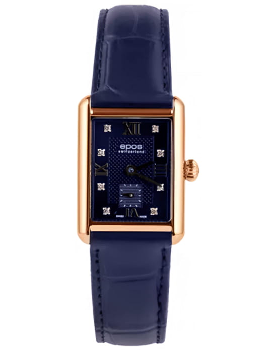 Epos 8002.702.24.86.16 — женская модель с утончённым классическим стилем и прямоугольным корпусом, выполненным из нержавеющей стали с PVD-покрытиемPVDУльтратонкое покрытие наносится в технике вакуумного напыления, сочетает в себе нитрид титана особой прочности со слоем золота или оксида хрома. Несёт в себе декоративную или защитную функцию.. Черный циферблат оформлен римскими индексами и утончённым узором «Clous de Paris», создающим игру света и подчёркивающим глубину дизайна. Защитную функцию выполняет сапфировое стеклоСапфировое стеклоПрочный и надёжный материал из кристалла сапфира синтетического происхождения, характеризующийся особой твёрдостью и устойчивостью к царапинам и повреждениям., стойкое к царапинам и сохраняющее прозрачность. В основе лежит швейцарский автоматический механизм, обеспечивающий стабильность и точность хода. Функции включают индикацию часов, минут и малую секундную шкалу, расположенную в позиции «6 часов». Часы дополнены кожаным ремешком, который гармонично завершает строгий образ модели.