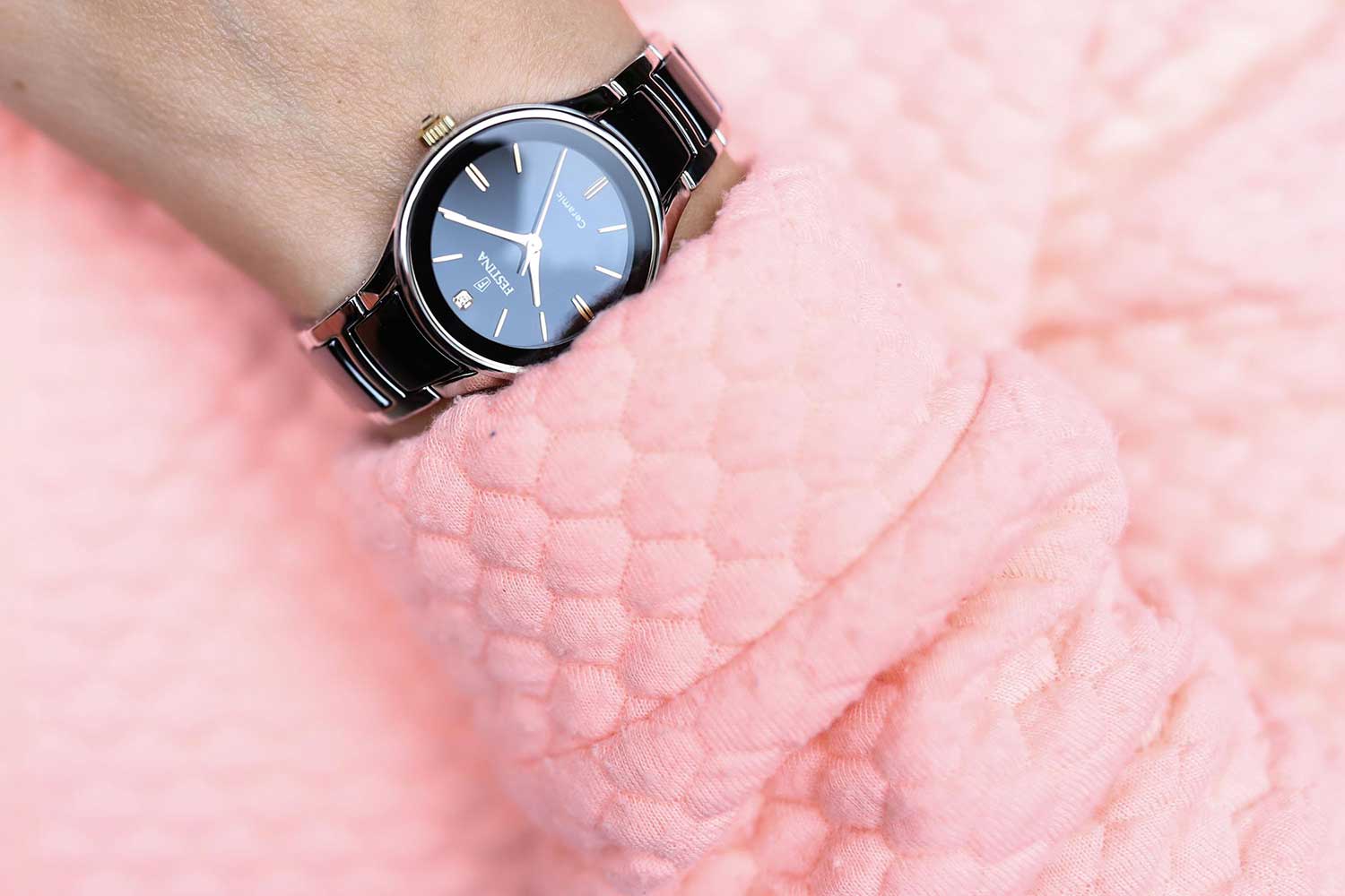 Яркий стиль и функциональность этих часов придутся по душе активной девушке. Кварцевый механизм с высокой точностью. Минеральное стеклоМинеральное стеклоМинеральное стекло представляет собой искусственно выращенный минерал кварца. Такое стекло отличается особой устойчивостью к повреждениям и царапинам. Уступает по некоторым качествам сапфировому стеклу. устойчивое к появлению царапин, обладающее высокой прозрачностью. Керамический неподвижный безельБезельВнешний ободок, закрепляющий стекло. В спортивных часах так называется поворотное кольцо с делениями на циферблате, выполняет роль таймера – замеряет отрезки времени на шкале. Неподвижный безель – элемент декора. Однонаправленно вращающийся безель на дайверских часах позволяет фиксировать моменты погружения и выныривания на поверхность.. Класс водозащиты: 50 метров, позволит защитить корпус от случайных брызг или капель дождя. Корпус часов изготовлен из нержавеющей стали. Браслет с керамическими вставками и с раскладной застёжкойРаскладная застёжкаТакой тип застёжки используется только на браслетах из металла. Она никогда не раскрывается полностью, происходит разделение на 2 и более частей. Раскладывающая застёжка снизит вероятность потери часов к минимуму..