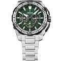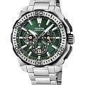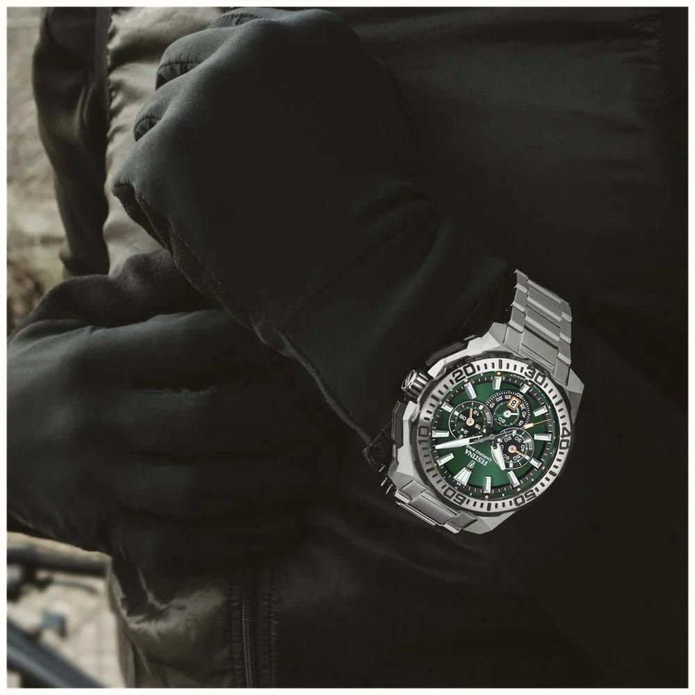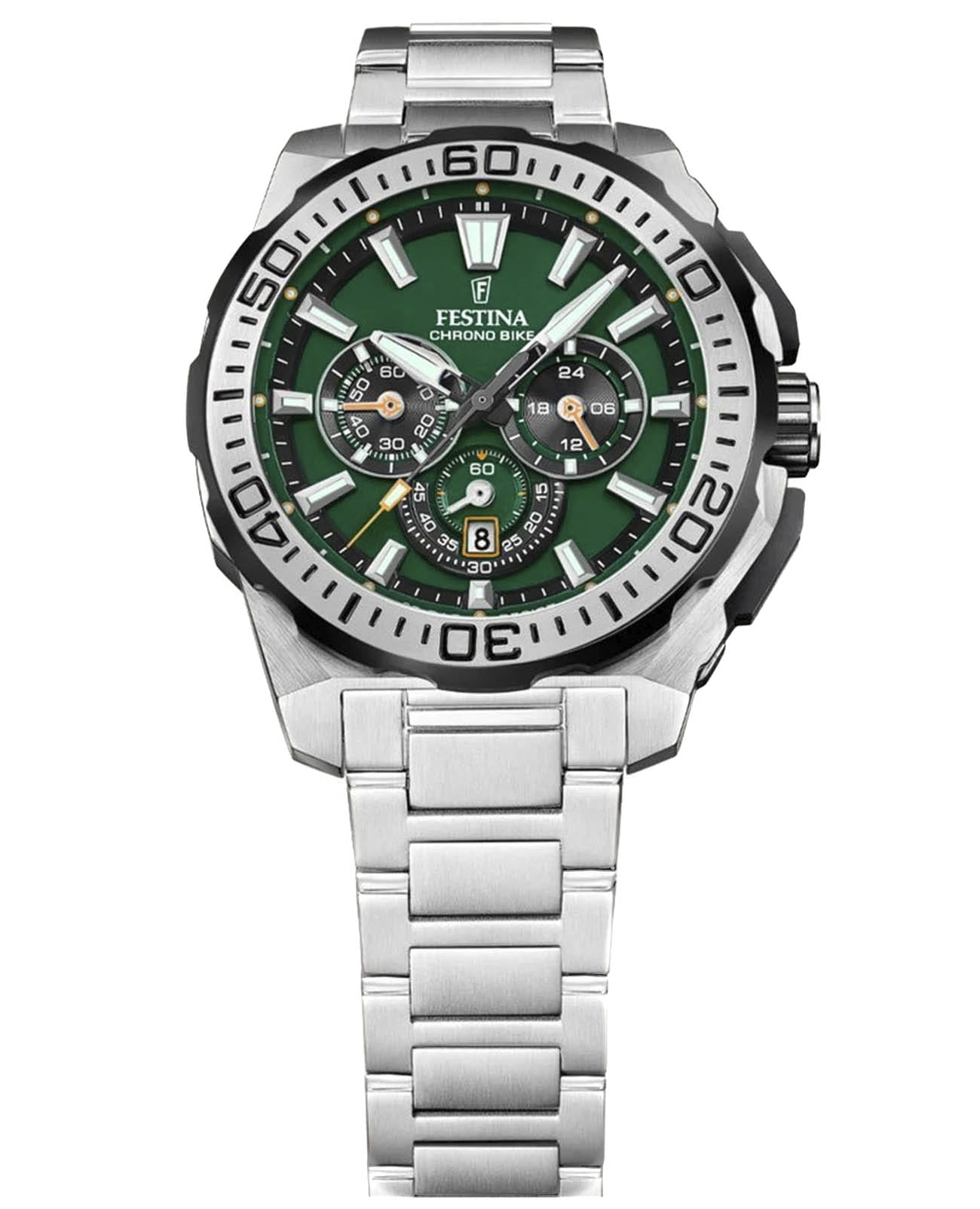 Мужские кварцевые часы Festina из коллекции Chrono-Bike — это выразительный спортивный аксессуар с функциональным дизайном. Корпус диаметром 45,5 мм и толщиной 14,4 мм выполнен из нержавеющей стали. Циферблат зелёного цвета оформлен метками в виде палочек и дополнен функцией хронографаХронографФункция позволяет измерять отрезки времени с особой точностью: часы, минуты, секунды. Верным признаком хронографа является наличие на циферблате 3 дополнительных окошек-счётчиков. и окошком даты. Стрелки и метки с люминесцентным покрытиемЛюминесцентное покрытиеПозволяет считывать показания времени в темноте. Производители наносят на стрелки, часовые индексы, безель или поверхность циферблата светонакопительный состав, дающий холодное свечение., обеспечивающим хорошую читаемость в темноте. Циферблат защищён минеральным стекломМинеральное стеклоМинеральное стекло представляет собой искусственно выращенный минерал кварца. Такое стекло отличается особой устойчивостью к повреждениям и царапинам. Уступает по некоторым качествам сапфировому стеклу.. Безель — стальной, неподвижный с IP-покрытиемIP-покрытиеМетод ионного напыления. Демонстрирует повышенную устойчивость к истиранию, окислению и химическим веществам. Под воздействием высокого давления и температуры около 1500°C молекулы металла надёжно соединяются с частицами корпуса часов.. Завинчивающаяся коронка и задняя крышка повышают надёжность конструкции. Часы оснащены стальным браслетом на раскладной застёжкеРаскладная застёжкаТакой тип застёжки используется только на браслетах из металла. Она никогда не раскрывается полностью, происходит разделение на 2 и более частей. Раскладывающая застёжка снизит вероятность потери часов к минимуму. с кнопками. Механизм — японский кварцевый калибр Miyota 0S20 с 60-месячным сроком службы батареи. Водонепроницаемость 200 м позволяет использовать часы для плавания и дайвинга. Вес — 206 г. Универсальный выбор для тех, кто ценит надёжность, функциональность и современный стиль.