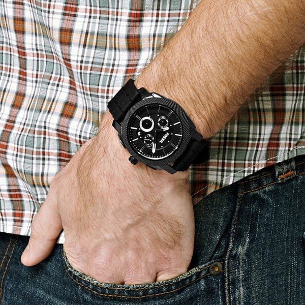 Наручные часы, предназначенные для мужчин. Внушительный спортивный дизайн, насыщенное элементами оформление. Кварцевый механизм с функцией хронографа. Корпус выполнен из нержавеющей стали 316L со стойким PVD покрытием. Ремешок из черного каучука. Минеральное стекло, устойчивое к возникновению царапин. Рельефный циферблат с накладными часовыми метками. Задняя крышка имеет винтовое соединение с корпусом. Водостойкость 50 метров (5АТМ).