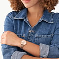 Женские наручные часы с минеральным стекломМинеральное стеклоМинеральное стекло представляет собой искусственно выращенный минерал кварца. Такое стекло отличается особой устойчивостью к повреждениям и царапинам. Уступает по некоторым качествам сапфировому стеклу. Fossil Laney BQ3862, кварцевый механизм с высокой точностью. Класс водозащиты: 50 метров, позволит защитить корпус от случайных брызг или капель дождя. БезельБезельВнешний ободок, закрепляющий стекло. В спортивных часах так называется поворотное кольцо с делениями на циферблате, выполняет роль таймера – замеряет отрезки времени на шкале. Неподвижный безель – элемент декора. Однонаправленно вращающийся безель на дайверских часах позволяет фиксировать моменты погружения и выныривания на поверхность. и браслет часов изготовлен из стали IP-покрытиемIP-покрытиеМетод ионного напыления. Демонстрирует повышенную устойчивость к истиранию, окислению и химическим веществам. Под воздействием высокого давления и температуры около 1500°C молекулы металла надёжно соединяются с частицами корпуса часов.. Метки в виде кристаллов. Рифленая заводная головка. Корпус из стали с IP-покрытиемIP-покрытиеМетод ионного напыления. Демонстрирует повышенную устойчивость к истиранию, окислению и химическим веществам. Под воздействием высокого давления и температуры около 1500°C молекулы металла надёжно соединяются с частицами корпуса часов.. Браслет с раскладной застёжкойРаскладная застёжкаТакой тип застёжки используется только на браслетах из металла. Она никогда не раскрывается полностью, происходит разделение на 2 и более частей. Раскладывающая застёжка снизит вероятность потери часов к минимуму..