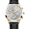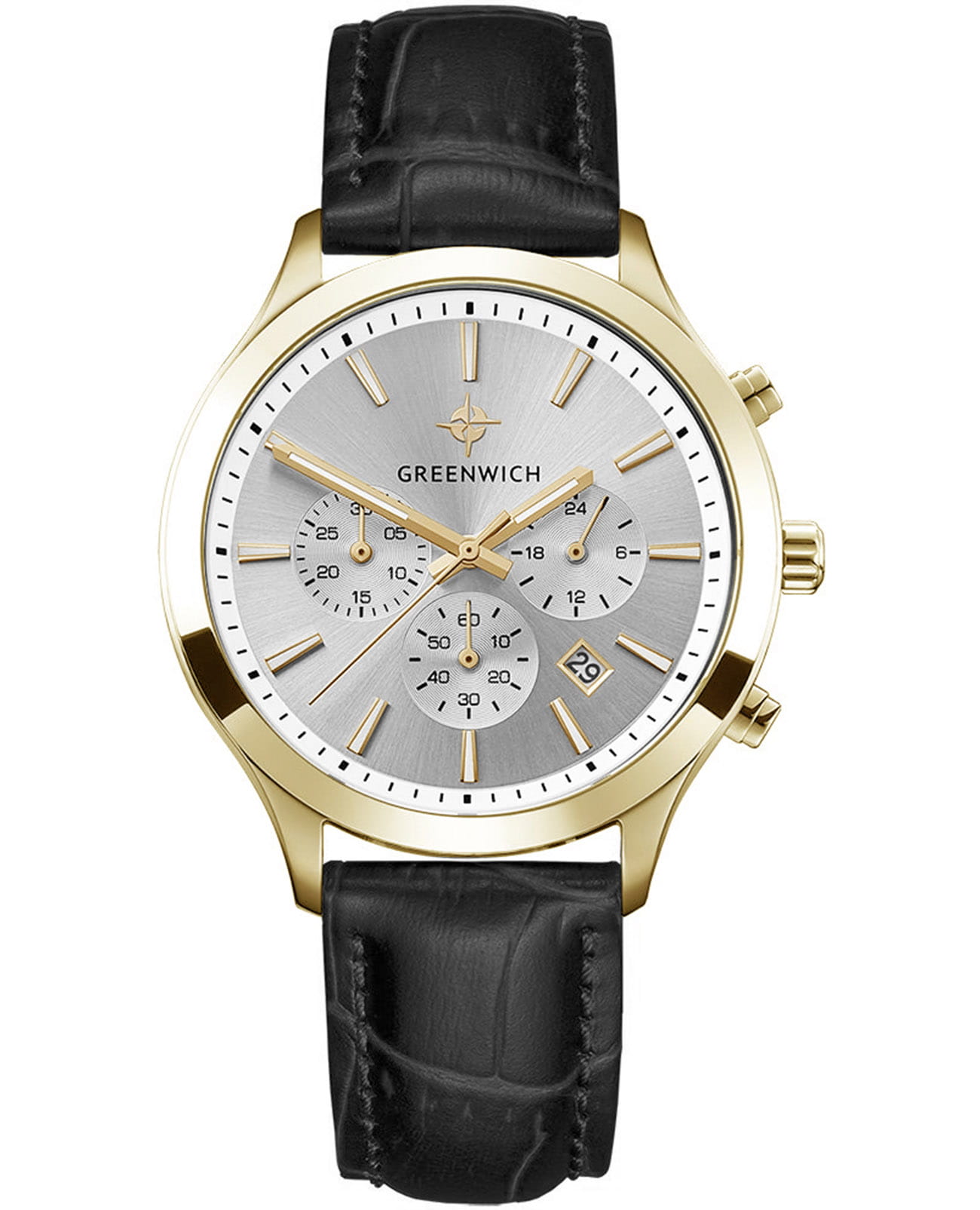 Мужские наручные часы-хронографХронографФункция позволяет измерять отрезки времени с особой точностью: часы, минуты, секунды. Верным признаком хронографа является наличие на циферблате 3 дополнительных окошек-счётчиков. Greenwich Skipper GW 043.21.33 представляют собой классический вариант для повседневной носки. Циферблат украшается брендовым логотипом, изображающим Розу Ветров. Эмблема мореплавательского духа символизирует удачу, стремление достигнуть поставленной цели. Часы характеризуются традиционными формами, лаконичным исполнением, что делает модель элегантным дополнением к деловому костюму. Надёжный корпус из нержавеющей стали с PVD-покрытиемPVDУльтратонкое покрытие наносится в технике вакуумного напыления, сочетает в себе нитрид титана особой прочности со слоем золота или оксида хрома. Несёт в себе декоративную или защитную функцию. спасает японский механизм от повреждений и ударов. Минеральное стеклоМинеральное стеклоМинеральное стекло представляет собой искусственно выращенный минерал кварца. Такое стекло отличается особой устойчивостью к повреждениям и царапинам. Уступает по некоторым качествам сапфировому стеклу. отличается устойчивостью к образованию царапин на поверхности. СекундомерСекундомерСекундоме́р — прибор, способный измерять интервалы времени с точностью до долей секунды.. Стрелки и метки с люминесцентным покрытиемЛюминесцентное покрытиеПозволяет считывать показания времени в темноте. Производители наносят на стрелки, часовые индексы, безель или поверхность циферблата светонакопительный состав, дающий холодное свечение.. Кожаный ремешок на стандартной застёжке. Окошко даты находится в положении между 4 и 5 часов. Класс водозащиты: 100 метров, позволит плавать, нырять и заниматься другими водными видами спорта.