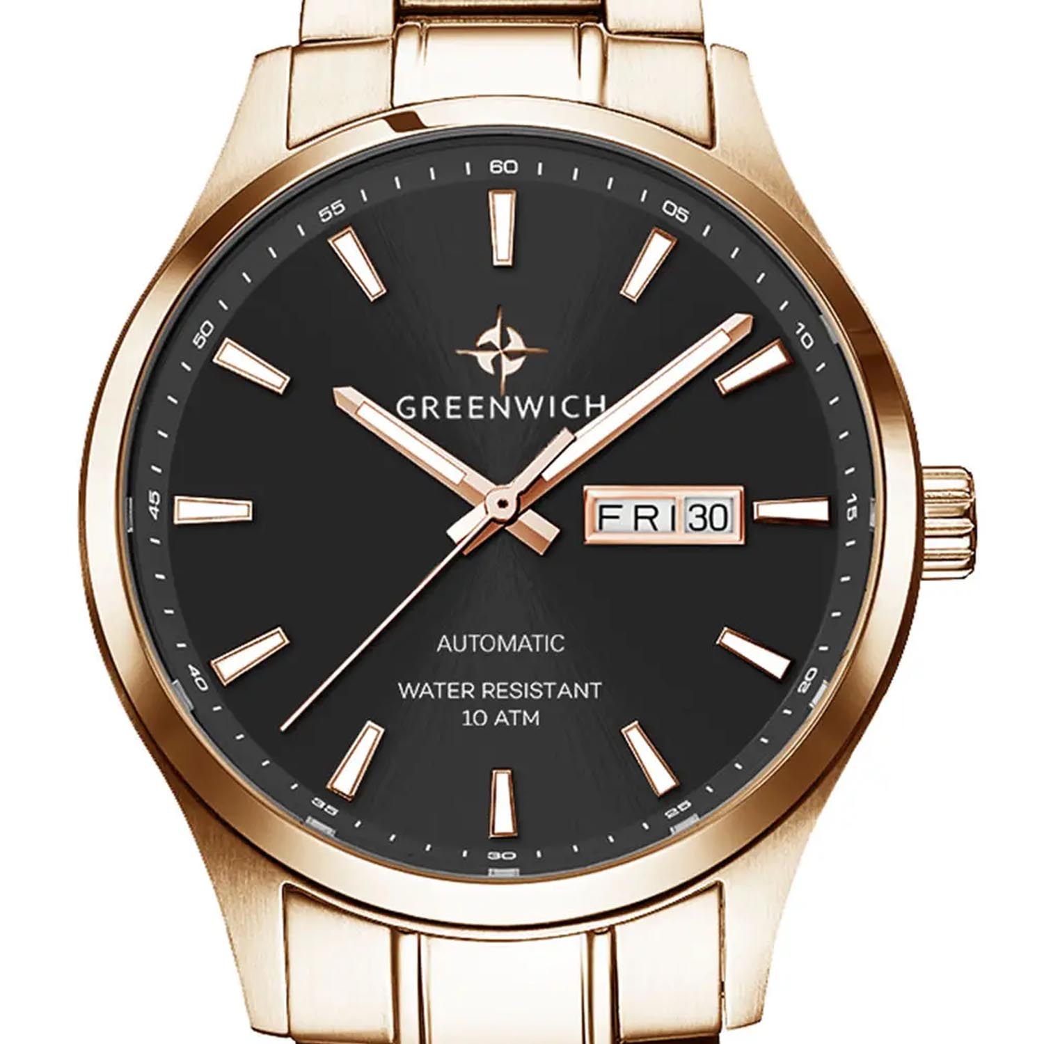 Мужские часы Greenwich Good Luck GW 054.40.31, механический механизм (автоматический калибр) с высокой точностью. Классический круглый стальной корпус с PVD-покрытиемPVDУльтратонкое покрытие наносится в технике вакуумного напыления, сочетает в себе нитрид титана особой прочности со слоем золота или оксида хрома. Несёт в себе декоративную или защитную функцию., защищенный минеральным стекломМинеральное стеклоМинеральное стекло представляет собой искусственно выращенный минерал кварца. Такое стекло отличается особой устойчивостью к повреждениям и царапинам. Уступает по некоторым качествам сапфировому стеклу.. Стрелки и метки с люминесцентным покрытиемЛюминесцентное покрытиеПозволяет считывать показания времени в темноте. Производители наносят на стрелки, часовые индексы, безель или поверхность циферблата светонакопительный состав, дающий холодное свечение.. Стальной браслет с PVD-покрытиемPVDУльтратонкое покрытие наносится в технике вакуумного напыления, сочетает в себе нитрид титана особой прочности со слоем золота или оксида хрома. Несёт в себе декоративную или защитную функцию. на раскладной застёжкеРаскладная застёжкаТакой тип застёжки используется только на браслетах из металла. Она никогда не раскрывается полностью, происходит разделение на 2 и более частей. Раскладывающая застёжка снизит вероятность потери часов к минимуму.. Класс водозащиты: 100 метров, позволит плавать, нырять и заниматься другими водными видами спорта. Окошко даты и дня недели находится в положении 3 часа.