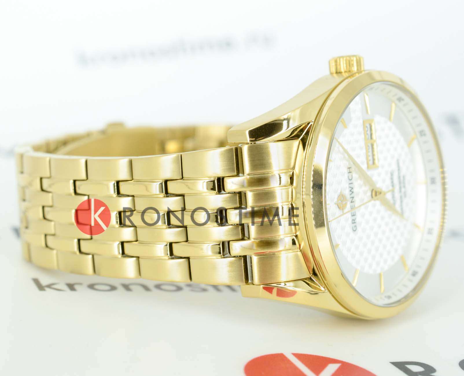 Мужские часы с минеральным стекломМинеральное стеклоМинеральное стекло представляет собой искусственно выращенный минерал кварца. Такое стекло отличается особой устойчивостью к повреждениям и царапинам. Уступает по некоторым качествам сапфировому стеклу. Greenwich Good Luck Classic GW 074.20.33, представляют собой классический вариант для повседневной носки. В центральной части циферблата — отличительная черта моделей этой серии: гильоше, объемные линии которого напоминают волны. Обратите внимание на форму пластины, где крепятся накладные риски: она сделана в форме латинской буквы G, первой буквы в названии бренда. Часы характеризуются традиционными формами, лаконичным исполнением, что делает модель элегантным дополнением к деловому костюму. Сквозь прозрачную заднюю крышку вы увидите детали механизма TMI с декорированным ротором: на нем выгравировано изображение символа английских моряков — парусника. Браслет и раскладная застёжкаРаскладная застёжкаТакой тип застёжки используется только на браслетах из металла. Она никогда не раскрывается полностью, происходит разделение на 2 и более частей. Раскладывающая застёжка снизит вероятность потери часов к минимуму. выполнены из гипоаллергенной нержавеющей стали с PVD-покрытиемPVDУльтратонкое покрытие наносится в технике вакуумного напыления, сочетает в себе нитрид титана особой прочности со слоем золота или оксида хрома. Несёт в себе декоративную или защитную функцию.. Дизайн, актуальный для любого современного образа, и надежность используемых материалов делают автоматические часы Greenwich удобным и стильным аксессуаром на каждый день. Окошко даты и дня недели находится в положении 3 часа. Класс водозащиты: 100 метров, позволит плавать, нырять и заниматься другими водными видами спорта.