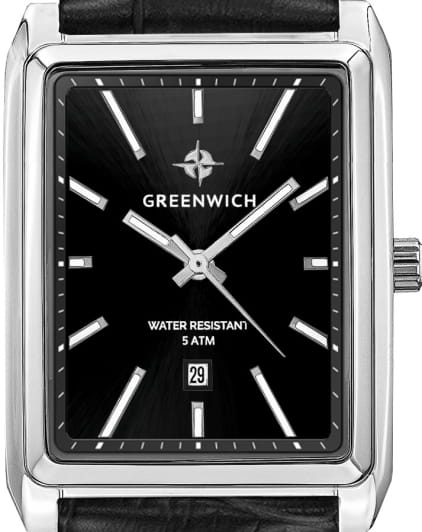 Мужские часы с минеральным стекломМинеральное стеклоМинеральное стекло представляет собой искусственно выращенный минерал кварца. Такое стекло отличается особой устойчивостью к повреждениям и царапинам. Уступает по некоторым качествам сапфировому стеклу. Greenwich Galeon GW 571.11.11, представляют собой классический вариант для повседневной носки. Корпус часов выполнен из нержавеющей стали. Окошко даты находится в положении 6 часов. Стрелки с люминесцентным покрытиемЛюминесцентное покрытиеПозволяет считывать показания времени в темноте. Производители наносят на стрелки, часовые индексы, безель или поверхность циферблата светонакопительный состав, дающий холодное свечение.. Кожаный ремешок на стандартной застежке.