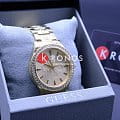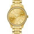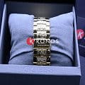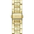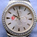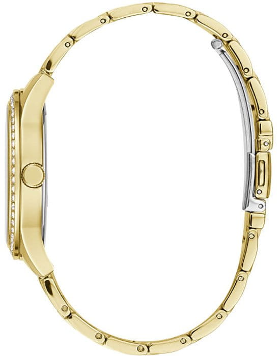 Аксессуар в золотистом цвете наделён безелемБезельВнешний ободок, закрепляющий стекло. В спортивных часах так называется поворотное кольцо с делениями на циферблате, выполняет роль таймера – замеряет отрезки времени на шкале. Неподвижный безель – элемент декора. Однонаправленно вращающийся безель на дайверских часах позволяет фиксировать моменты погружения и выныривания на поверхность. с роскошными кристаллами Swarovski. Центральная часть звеньев стального браслета с IP-покрытиемIP-покрытиеМетод ионного напыления. Демонстрирует повышенную устойчивость к истиранию, окислению и химическим веществам. Под воздействием высокого давления и температуры около 1500°C молекулы металла надёжно соединяются с частицами корпуса часов. дополнена узнаваемым логотипом бренда. За высокую точность хода отвечает японский кварцевый механизм. Минеральное стекло с закаленной поверхностью устойчиво к царапинам. Сохраняется водонепроницаемость при давлении 3 бар: часы выдержат случайные брызги воды.