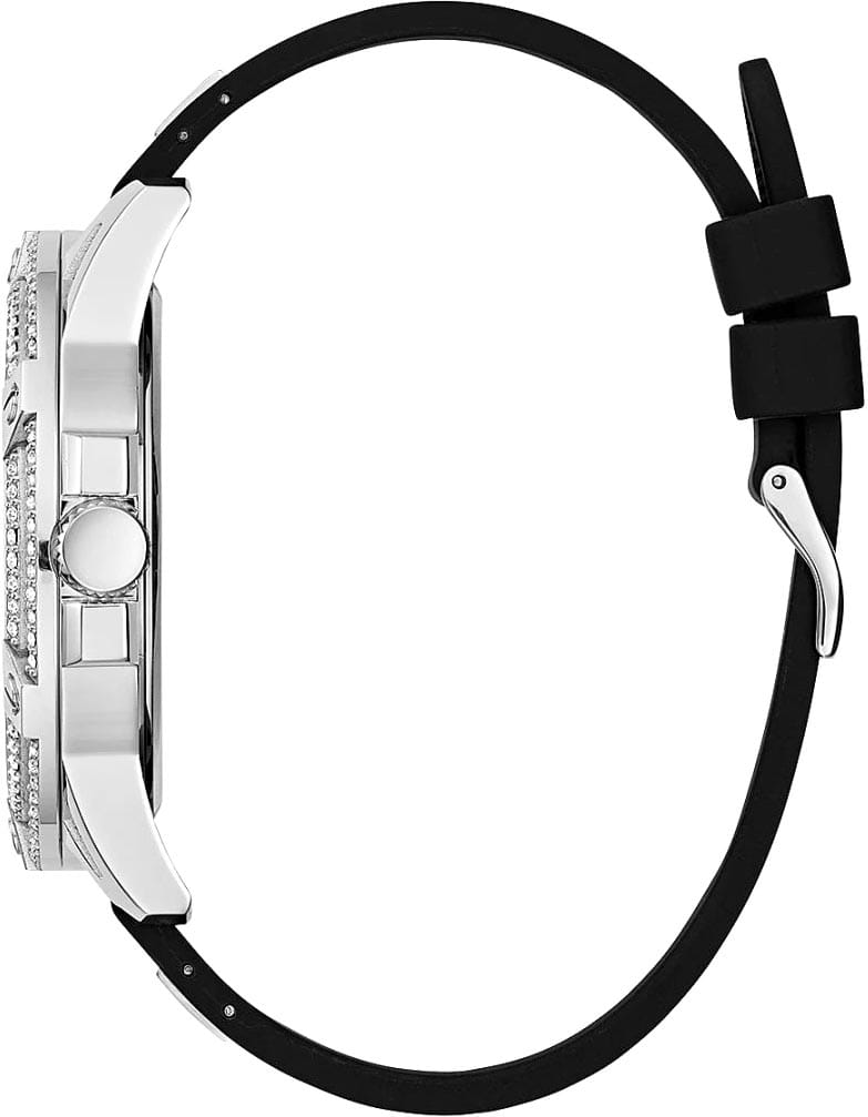 Мужские наручные часы Guess GW0537G1 с минеральным стекломМинеральное стеклоМинеральное стекло представляет собой искусственно выращенный минерал кварца. Такое стекло отличается особой устойчивостью к повреждениям и царапинам. Уступает по некоторым качествам сапфировому стеклу., кварцевый механизм с высокой точностью. Класс водозащиты: 50 метров, позволит защитить корпус от случайных брызг или капель дождя. Стрелки с люминесцентным покрытиемЛюминесцентное покрытиеПозволяет считывать показания времени в темноте. Производители наносят на стрелки, часовые индексы, безель или поверхность циферблата светонакопительный состав, дающий холодное свечение.. Корпус часов изготовлен из стали. Силиконовый ремешок на стандартной застёжке. Корпус и циферблат украшены кристаллами.