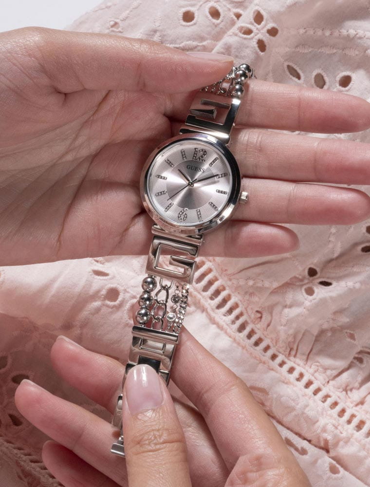 Женские кварцевые наручные часы с минеральным стекломМинеральное стеклоМинеральное стекло представляет собой искусственно выращенный минерал кварца. Такое стекло отличается особой устойчивостью к повреждениям и царапинам. Уступает по некоторым качествам сапфировому стеклу. Guess G Cluster GW0545L1, кварцевый механизм с высокой точностью. Класс водозащиты: 30 метров, позволит защитить корпус от случайных брызг или капель дождя. Корпус часов изготовлен из стали. Стальной браслет на ювелирной застёжке. Циферблат инкрустирован кристаллами.