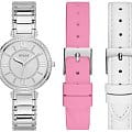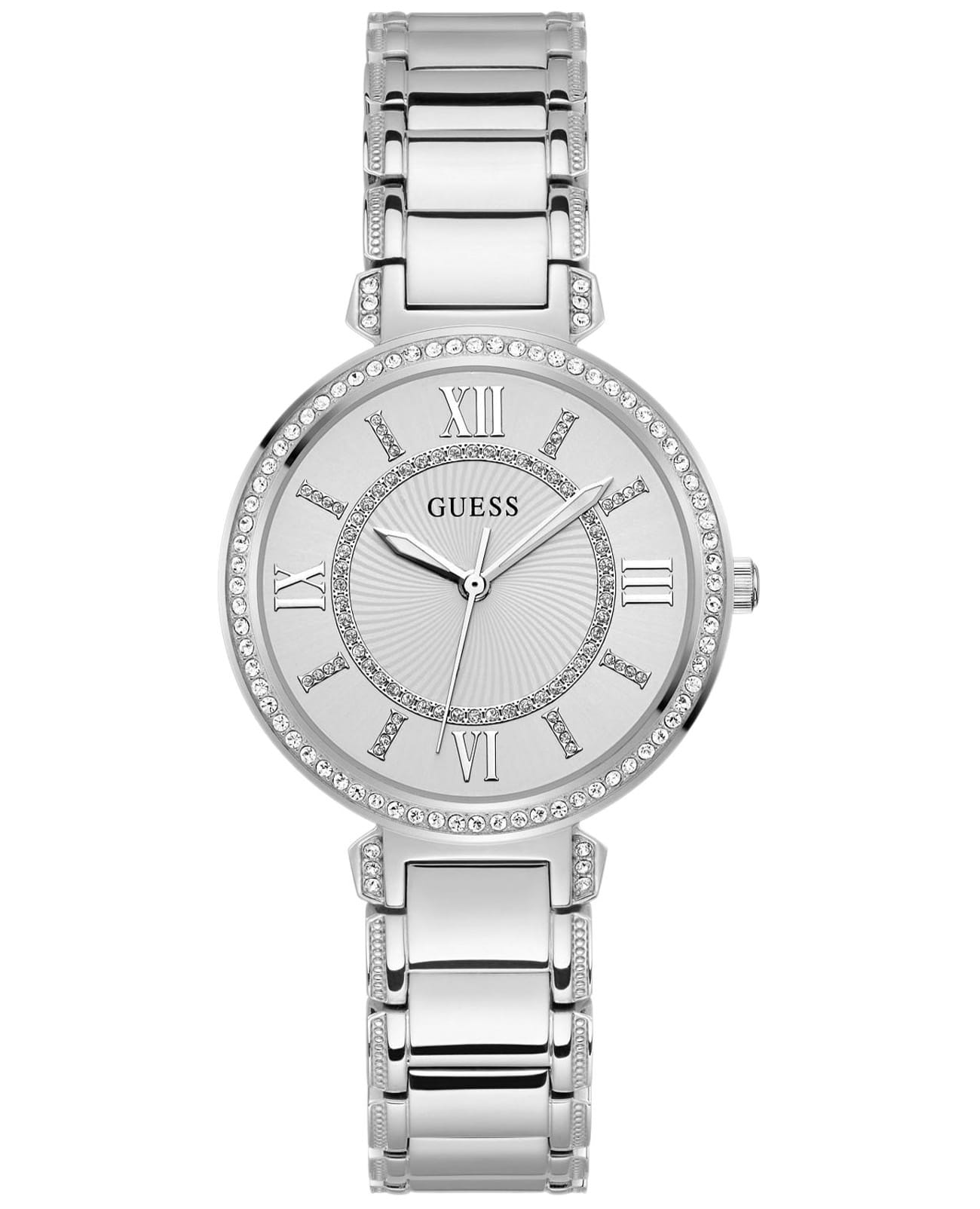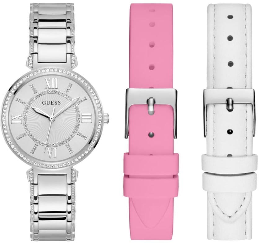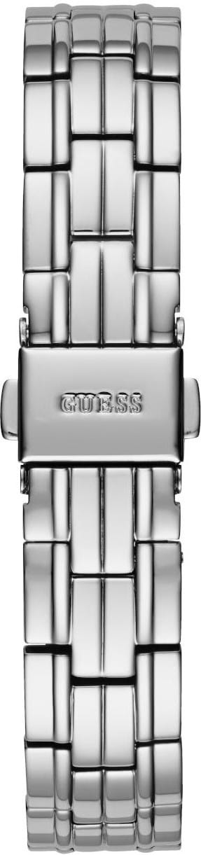 Женские наручные часы с минеральным стекломМинеральное стеклоМинеральное стекло представляет собой искусственно выращенный минерал кварца. Такое стекло отличается особой устойчивостью к повреждениям и царапинам. Уступает по некоторым качествам сапфировому стеклу. Guess Montage GW0588L2, кварцевый механизм с высокой точностью. Класс водозащиты: 30 метров, позволит защитить корпус от случайных брызг или капель дождя. Корпус часов изготовлен из стали. Стальной браслет на раскладной застёжкеРаскладная застёжкаТакой тип застёжки используется только на браслетах из металла. Она никогда не раскрывается полностью, происходит разделение на 2 и более частей. Раскладывающая застёжка снизит вероятность потери часов к минимуму.. Циферблат инкрустирован кристаллами. Циферблат выполнен по технологии Sunray (солнечные лучи). Метки в виде римских цифр и штрихов с кристаллами. Рифленая заводная головка.