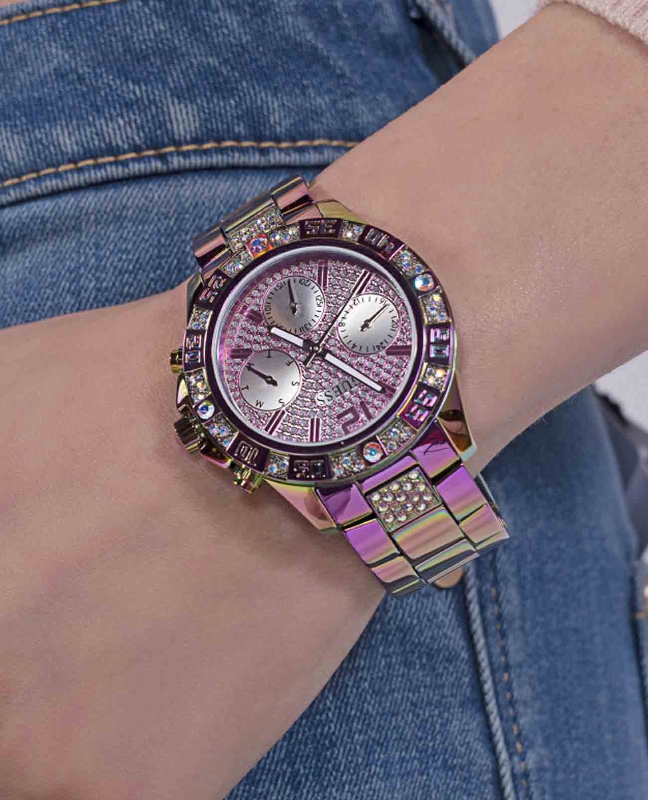 Женские наручные часы Guess Dress GW0771L4 с минеральным стекломМинеральное стеклоМинеральное стекло представляет собой искусственно выращенный минерал кварца. Такое стекло отличается особой устойчивостью к повреждениям и царапинам. Уступает по некоторым качествам сапфировому стеклу., кварцевый механизм с высокой точностью. Корпус часов изготовлен из стали с IP-покрытиемIP-покрытиеМетод ионного напыления. Демонстрирует повышенную устойчивость к истиранию, окислению и химическим веществам. Под воздействием высокого давления и температуры около 1500°C молекулы металла надёжно соединяются с частицами корпуса часов.. БезельБезельВнешний ободок, закрепляющий стекло. В спортивных часах так называется поворотное кольцо с делениями на циферблате, выполняет роль таймера – замеряет отрезки времени на шкале. Неподвижный безель – элемент декора. Однонаправленно вращающийся безель на дайверских часах позволяет фиксировать моменты погружения и выныривания на поверхность. с IP-покрытиемIP-покрытиеМетод ионного напыления. Демонстрирует повышенную устойчивость к истиранию, окислению и химическим веществам. Под воздействием высокого давления и температуры около 1500°C молекулы металла надёжно соединяются с частицами корпуса часов. украшен кристаллами. Стрелки с люминесцентным покрытиемЛюминесцентное покрытиеПозволяет считывать показания времени в темноте. Производители наносят на стрелки, часовые индексы, безель или поверхность циферблата светонакопительный состав, дающий холодное свечение.. Класс водозащиты: 50 метров, позволит защитить корпус от случайных брызг или капель дождя. Стальной браслет с IP-покрытиемIP-покрытиеМетод ионного напыления. Демонстрирует повышенную устойчивость к истиранию, окислению и химическим веществам. Под воздействием высокого давления и температуры около 1500°C молекулы металла надёжно соединяются с частицами корпуса часов. на раскладной застёжкеРаскладная застёжкаТакой тип застёжки используется только на браслетах из металла. Она никогда не раскрывается полностью, происходит разделение на 2 и более частей. Раскладывающая застёжка снизит вероятность потери часов к минимуму..