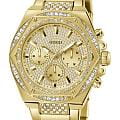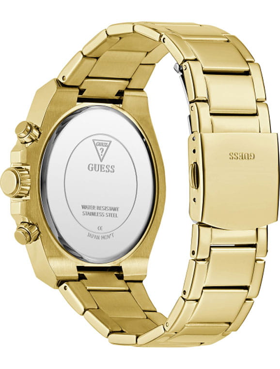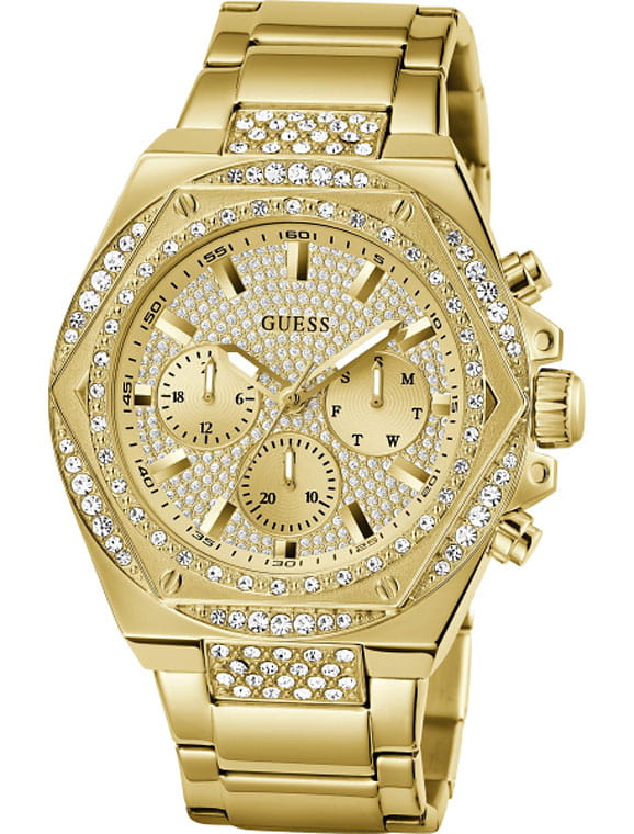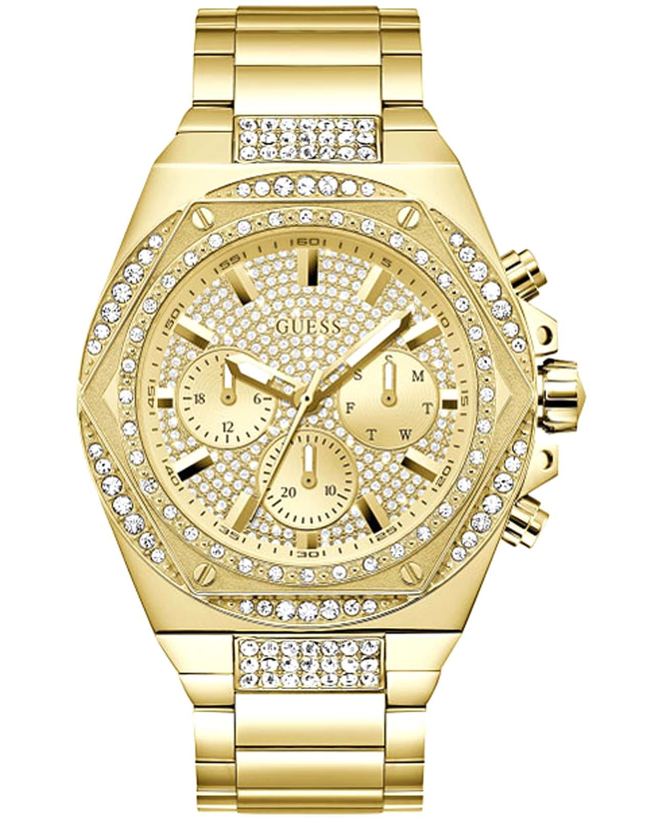 Мужские наручные часы Guess GW0899G2 – это сочетание элегантности и современного стиля. Они оснащены надежным кварцевым механизмом, который обеспечивает точность хода. Корпус часов выполнен из стали с PVD-покрытиемPVDУльтратонкое покрытие наносится в технике вакуумного напыления, сочетает в себе нитрид титана особой прочности со слоем золота или оксида хрома. Несёт в себе декоративную или защитную функцию. золотистого цвета, безельБезельВнешний ободок, закрепляющий стекло. В спортивных часах так называется поворотное кольцо с делениями на циферблате, выполняет роль таймера – замеряет отрезки времени на шкале. Неподвижный безель – элемент декора. Однонаправленно вращающийся безель на дайверских часах позволяет фиксировать моменты погружения и выныривания на поверхность. декорирован кристаллами и винтами, придающими модели особый характер. Золотистый циферблат инкрустирован кристаллами и оснащен метками в виде штрихов, что добавляет изысканности и блеска. Часы поддерживают 12-ти и 24-х часовой формат времени, а также оснащены календарем, показывающим число и день недели на отдельных циферблатах. Люминесцентное покрытиеЛюминесцентное покрытиеПозволяет считывать показания времени в темноте. Производители наносят на стрелки, часовые индексы, безель или поверхность циферблата светонакопительный состав, дающий холодное свечение. на стрелках обеспечивает отличную видимость в темноте. Стальной браслет с раскладной застежкойРаскладная застёжкаТакой тип застёжки используется только на браслетах из металла. Она никогда не раскрывается полностью, происходит разделение на 2 и более частей. Раскладывающая застёжка снизит вероятность потери часов к минимуму. гарантирует комфортное ношение и надежную фиксацию. Минеральное стеклоМинеральное стеклоМинеральное стекло представляет собой искусственно выращенный минерал кварца. Такое стекло отличается особой устойчивостью к повреждениям и царапинам. Уступает по некоторым качествам сапфировому стеклу. защищает циферблат от царапин, а водозащита 30WR предохраняет часы от случайных брызг и дождя. Эта модель станет отличным выбором для тех, кто ценит стиль и функциональность в одном аксессуаре.