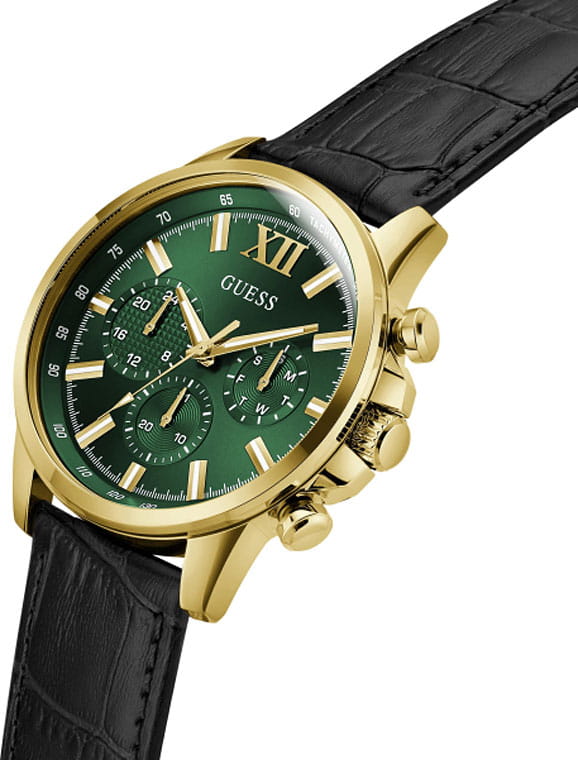 Стильные и функциональные часы Guess GW0901G4 оснащены кварцевым механизмом, что обеспечивает точность и надежность в использовании. Корпус выполнен из прочной стали с золотистым PVD-покрытиемPVDУльтратонкое покрытие наносится в технике вакуумного напыления, сочетает в себе нитрид титана особой прочности со слоем золота или оксида хрома. Несёт в себе декоративную или защитную функцию., придающей изделиям утонченный и современный вид. Циферблат украшен метками в виде штрихов и римской цифрой XII, обеспечивающими легкое считывание времени. Время отображается в двух форматах — 12-ти и 24-х часовом, что удобно для тех, кто привык к разным системам времени. Дополнительные циферблаты показывают дату и день недели, что позволяет всегда быть в курсе текущей даты без необходимости использования других устройств. Часы также оснащены тахиметромТахиметрРазмеченная шкала, располагается на ободке или безеле часов. Тахиметр позволяет рассчитать скорость на определённом участке пути, расстояние измеряется в километрах или милях., что добавляет им функциональности и может быть полезно для измерения скорости. Люминесцентное покрытиеЛюминесцентное покрытиеПозволяет считывать показания времени в темноте. Производители наносят на стрелки, часовые индексы, безель или поверхность циферблата светонакопительный состав, дающий холодное свечение. на стрелках и метках обеспечивает отличную видимость в темноте. Минеральное стеклоМинеральное стеклоМинеральное стекло представляет собой искусственно выращенный минерал кварца. Такое стекло отличается особой устойчивостью к повреждениям и царапинам. Уступает по некоторым качествам сапфировому стеклу. защищает циферблат от царапин и повреждений, а водозащита 50WR позволяет не волноваться о случайных контактах с водой, например, во время дождя. Кожаный черный ремешок с классической застежкой обеспечивает надежную фиксацию часов на руке и комфорт в ношении. Рифленая заводная головка с защитой добавляет изысканности и одновременно защищает механизм от повреждений. Эти часы идеально подойдут для тех, кто ценит стиль, функциональность и качество в одном аксессуаре.