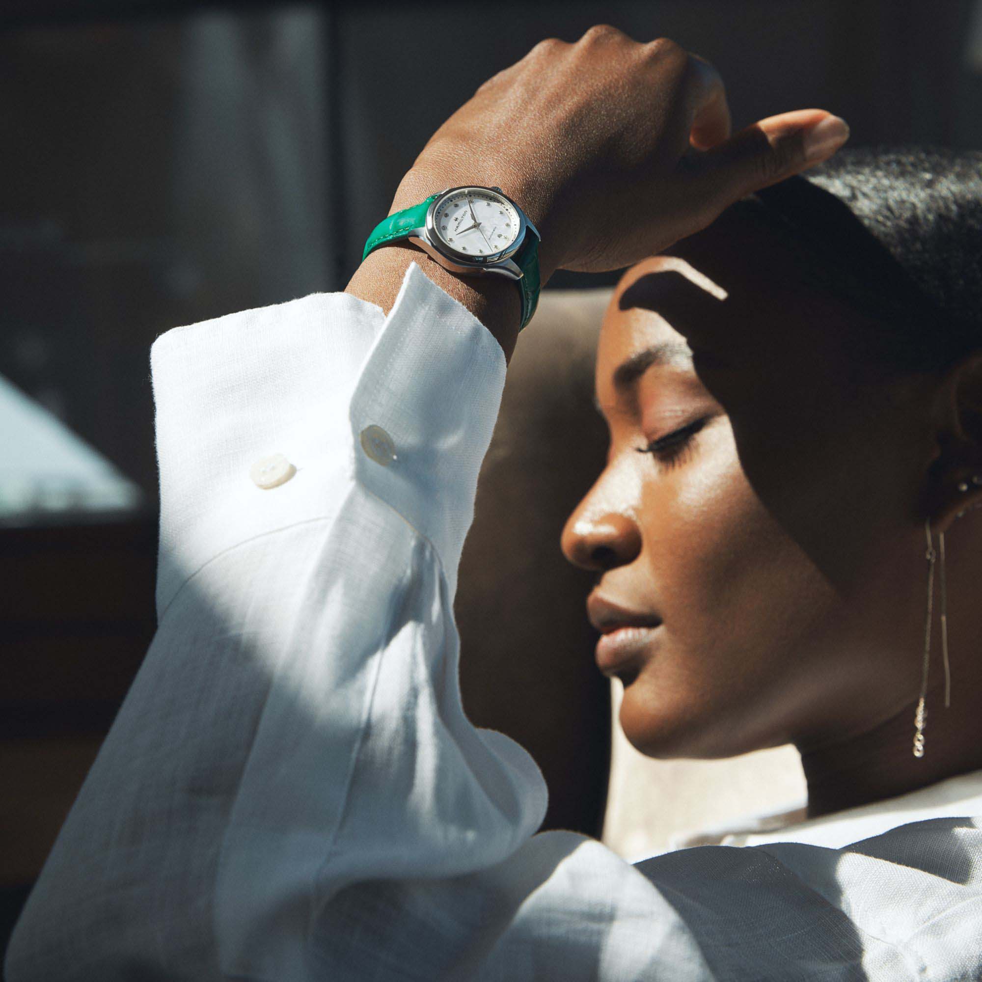 Роскошный ремешок из зеленой кожи с отделкой из кожи аллигатора мгновенно придает харизму нашей модели Jazzmaster Lady Auto. 30-миллиметровые часы с красивым перламутровым циферблатом и 12 бриллиантовыми индексами, оснащенные автоматическим механизмом с 44-часовым запасом хода, органично сочетают смелый стиль с утонченными деталями. Сапфировое стеклоСапфировое стеклоПрочный и надёжный материал из кристалла сапфира синтетического происхождения, характеризующийся особой твёрдостью и устойчивостью к царапинам и повреждениям. устойчивое к появлению царапин, обладающее высокой прозрачностью. Класс водозащиты: 50 метров, позволит защитить корпус от случайных брызг или капель дождя. Корпус часов изготовлен из нержавеющей стали.
