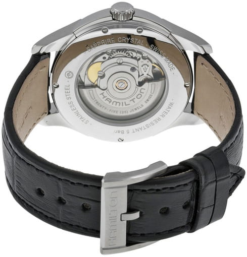 Мужские швейцарские механические часы с автоподзаводом Hamilton Jazzmaster Day Date Auto H32505731. Сапфировое стеклоСапфировое стеклоПрочный и надёжный материал из кристалла сапфира синтетического происхождения, характеризующийся особой твёрдостью и устойчивостью к царапинам и повреждениям. устойчивое к мелким механическим повреждениям. Корпус часов изготовлен из нержавеющей стали. Кожаный ремешок на стандартной застёжке. Класс водозащиты: 50 метров, позволит защитить корпус от случайных брызг или капель дождя. Стрелки и метки с люминесцентным покрытиемЛюминесцентное покрытиеПозволяет считывать показания времени в темноте. Производители наносят на стрелки, часовые индексы, безель или поверхность циферблата светонакопительный состав, дающий холодное свечение.. Окошко даты находится в положении 6 часов. Индикация дня недели в области 12 часов.