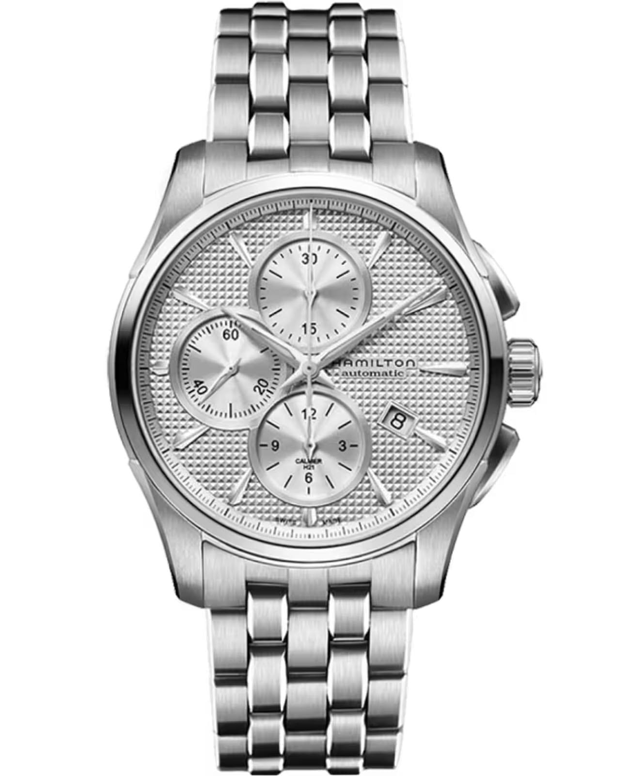 Часы-хронографХронографФункция позволяет измерять отрезки времени с особой точностью: часы, минуты, секунды. Верным признаком хронографа является наличие на циферблате 3 дополнительных окошек-счётчиков. Hamilton Jazzmaster Auto Chrono H32596151 с автоматическим механизмом высокой точности. Сапфировое стеклоСапфировое стеклоПрочный и надёжный материал из кристалла сапфира синтетического происхождения, характеризующийся особой твёрдостью и устойчивостью к царапинам и повреждениям. устойчивое к появлению царапин, обладающее высокой прозрачностью. Класс водозащиты: 100 метров, позволит плавать, нырять и заниматься другими водными видами спорта. Корпус и браслет часов изготовлены из нержавеющей стали. Стальной браслет на застёжке-бабочке с кнопкамиЗастёжка "бабочка"Такой вид застёжки дополняется предохранителями, помогающими избежать случайного раскрытия браслета. Обладают изящным исполнением. . Стрелки и метки с люминесцентным покрытиемЛюминесцентное покрытиеПозволяет считывать показания времени в темноте. Производители наносят на стрелки, часовые индексы, безель или поверхность циферблата светонакопительный состав, дающий холодное свечение.. Окошко даты находится в положении 4 часа.