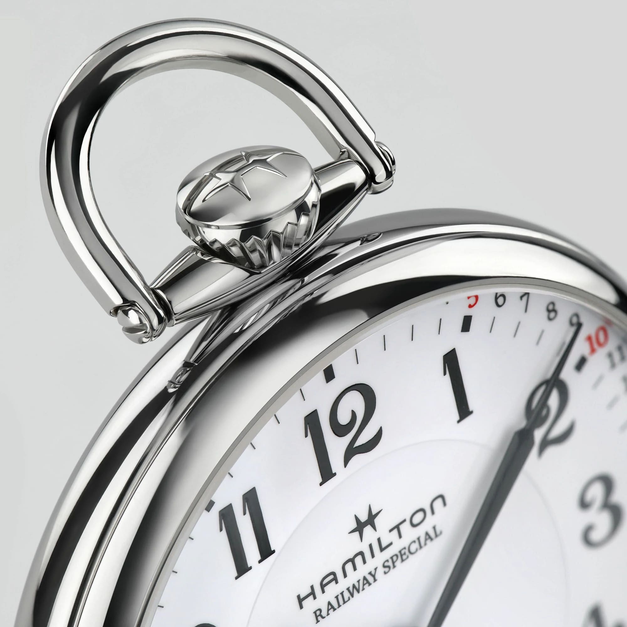 Перенеситесь на 130 лет вперед с помощью наших карманных механических часов Railroad. Специальное издание, ограниченное 917 экземплярами, посвящено Hamilton как "часам железнодорожной точности". Сапфировое стеклоСапфировое стеклоПрочный и надёжный материал из кристалла сапфира синтетического происхождения, характеризующийся особой твёрдостью и устойчивостью к царапинам и повреждениям. защищает белый циферблат, покрытый эмалью. Все метки и увеличенные арабские цифры очень чёткие, яркие, с отличной читаемостью. На верхней части корпуса расположена выдвижная заводная головка с рифлёной поверхность, защищённая планкой. К ней можно прикрепить цепочку, входящую в комплект. На задней крышке нанесена гравировка с поездом и надписью «130th Anniversary Railway Special».