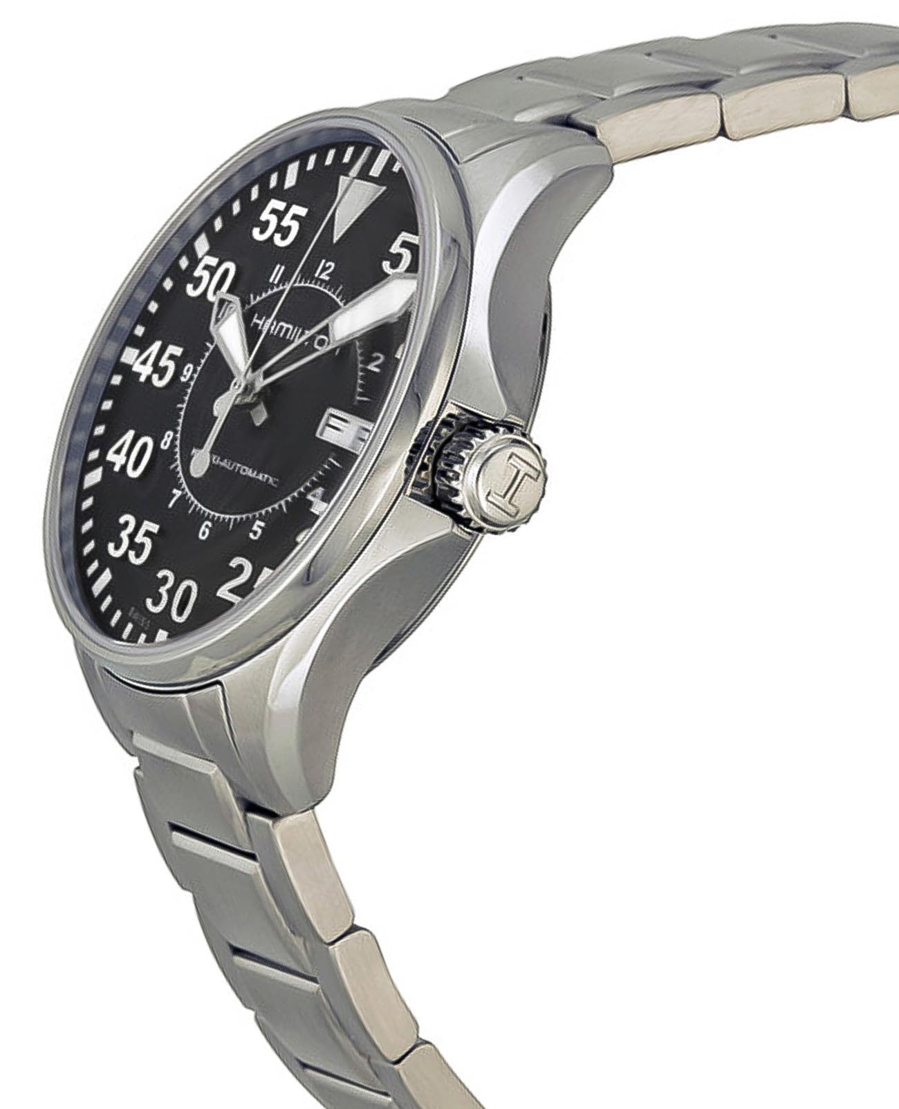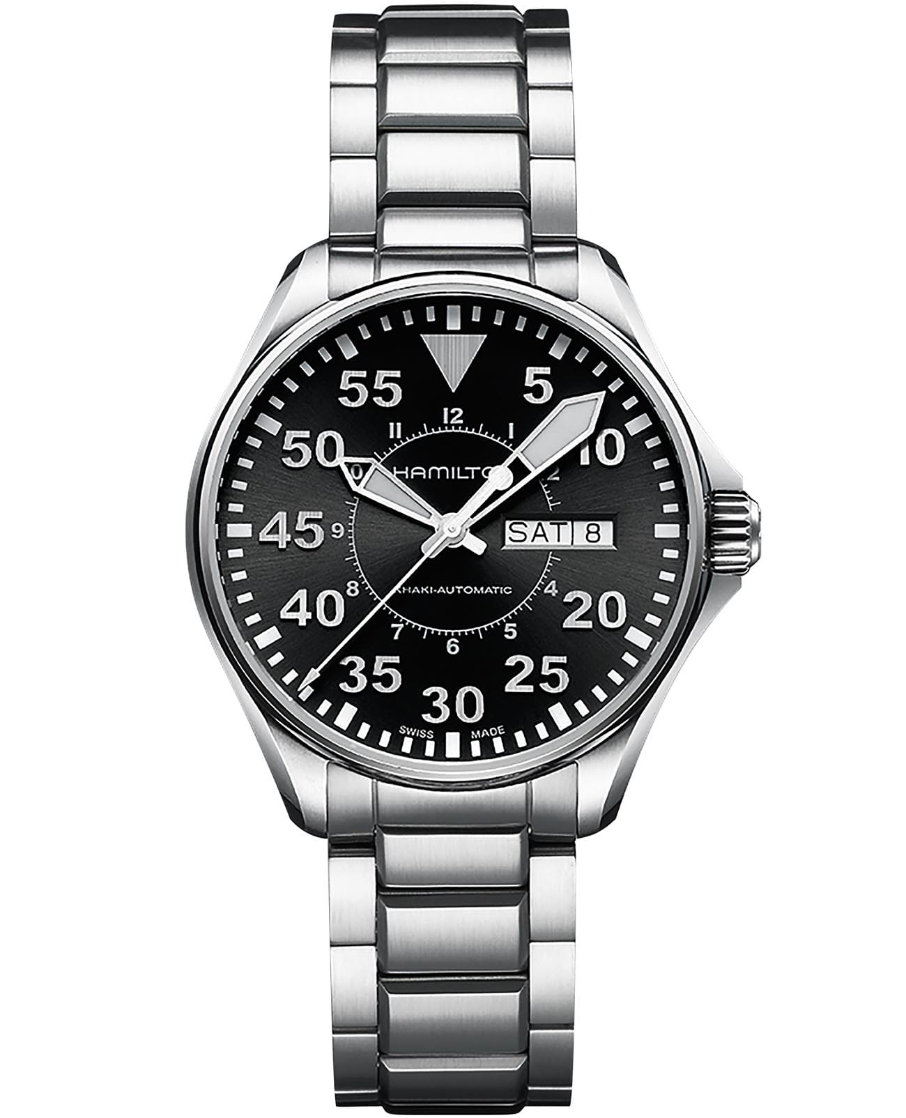Мужские часы с автоматическим механизмом Hamilton Khaki Aviation Pilot Day Date Auto H64425135. Корпус часов изготовлен из нержавеющей стали. Стальной браслет на раскладной застёжкеРаскладная застёжкаТакой тип застёжки используется только на браслетах из металла. Она никогда не раскрывается полностью, происходит разделение на 2 и более частей. Раскладывающая застёжка снизит вероятность потери часов к минимуму.. Сапфировое стеклоСапфировое стеклоПрочный и надёжный материал из кристалла сапфира синтетического происхождения, характеризующийся особой твёрдостью и устойчивостью к царапинам и повреждениям. с антибликовым покрытием. Окошко дня недели и даты расположены в районе 3 часов. Стрелки и метки с люминесцентным покрытиемЛюминесцентное покрытиеПозволяет считывать показания времени в темноте. Производители наносят на стрелки, часовые индексы, безель или поверхность циферблата светонакопительный состав, дающий холодное свечение.. Уровень влагозащиты: 100 метров, позволит плавать, нырять и заниматься другими водными видами спорта