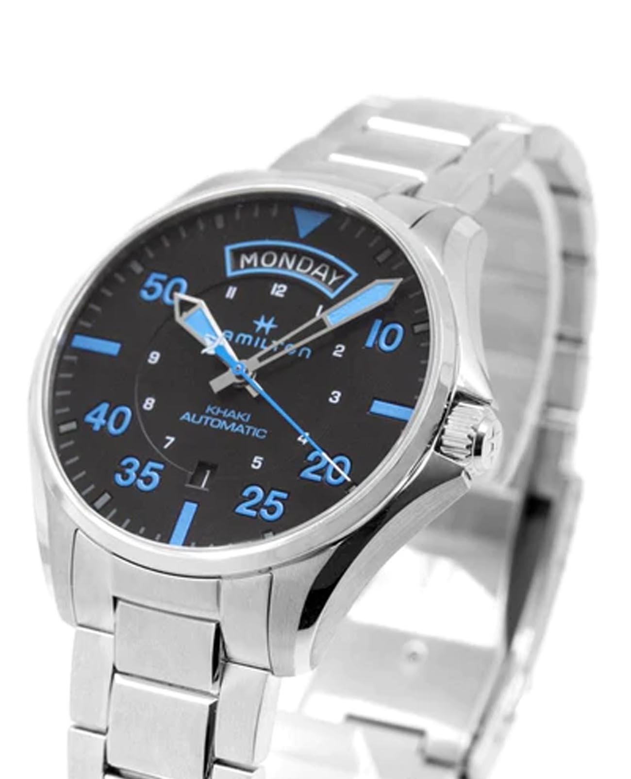 Мужские наручные часы Hamilton Khaki Aviation Pilot Day Date Air Zermatt Auto H64625131 с автоматическим механизмом. Корпус и браслет изготовлены из нержавеющей стали. Стальной браслет на раскладной застёжкеРаскладная застёжкаТакой тип застёжки используется только на браслетах из металла. Она никогда не раскрывается полностью, происходит разделение на 2 и более частей. Раскладывающая застёжка снизит вероятность потери часов к минимуму.. Стрелки и метки с люминесцентным покрытиемЛюминесцентное покрытиеПозволяет считывать показания времени в темноте. Производители наносят на стрелки, часовые индексы, безель или поверхность циферблата светонакопительный состав, дающий холодное свечение.. Сапфировое стеклоСапфировое стеклоПрочный и надёжный материал из кристалла сапфира синтетического происхождения, характеризующийся особой твёрдостью и устойчивостью к царапинам и повреждениям. устойчивое к мелким механическим повреждениям. Класс водозащиты: 100 метров, позволит плавать, нырять и заниматься другими водными видами спорта. Окошко дня недели и даты находятся в положении 12 и 6 часов.