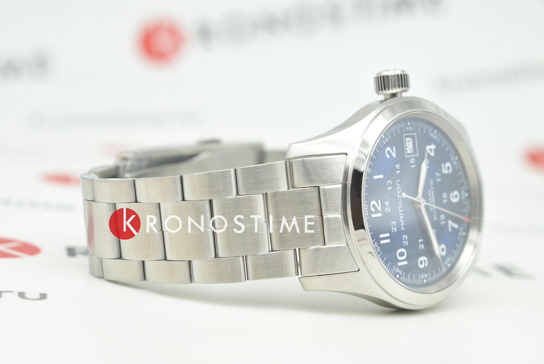 Hamilton Khaki Field Auto H70455140 — компактные полевые часы с военной эстетикой, надёжным механизмом и универсальным дизайном. Корпус диаметром 38 мм выполнен из нержавеющей стали с сатинированной отделкой. Прозрачная задняя крышка позволяет видеть работу механизма. Циферблат защищён сапфировым стекломСапфировое стеклоПрочный и надёжный материал из кристалла сапфира синтетического происхождения, характеризующийся особой твёрдостью и устойчивостью к царапинам и повреждениям. с антибликовым покрытиемАнтибликовое покрытиеСлой оксида металла в 0,13-0,3 микрон, благодаря которому стекло часов не бликует и не отражает свет. Антибликовое покрытие уменьшает отражение света в 10 раз, обеспечивая отличную читаемость показателей циферблата.. Синий циферблат с эффектом солнечных лучей оформлен в духе классических полевых часов: крупные арабские цифры, 24-часовая шкала, дата на позиции «3 часа». Стрелки и метки покрыты люминесцентным покрытиемЛюминесцентное покрытиеПозволяет считывать показания времени в темноте. Производители наносят на стрелки, часовые индексы, безель или поверхность циферблата светонакопительный состав, дающий холодное свечение. для читаемости в темноте. Внутри установлен автоматический механизм H-10 с запасом хода до 80 часов. Модель укомплектована браслетом из нержавеющей стали с раскладной застёжкойРаскладная застёжкаТакой тип застёжки используется только на браслетах из металла. Она никогда не раскрывается полностью, происходит разделение на 2 и более частей. Раскладывающая застёжка снизит вероятность потери часов к минимуму., обеспечивающей удобную посадку и надёжность. Водонепроницаемость 100 метров делает часы подходящими как для повседневной носки, так и для активного образа жизни. Khaki Field Auto 38 мм — это проверенная временем классика в современном исполнении.