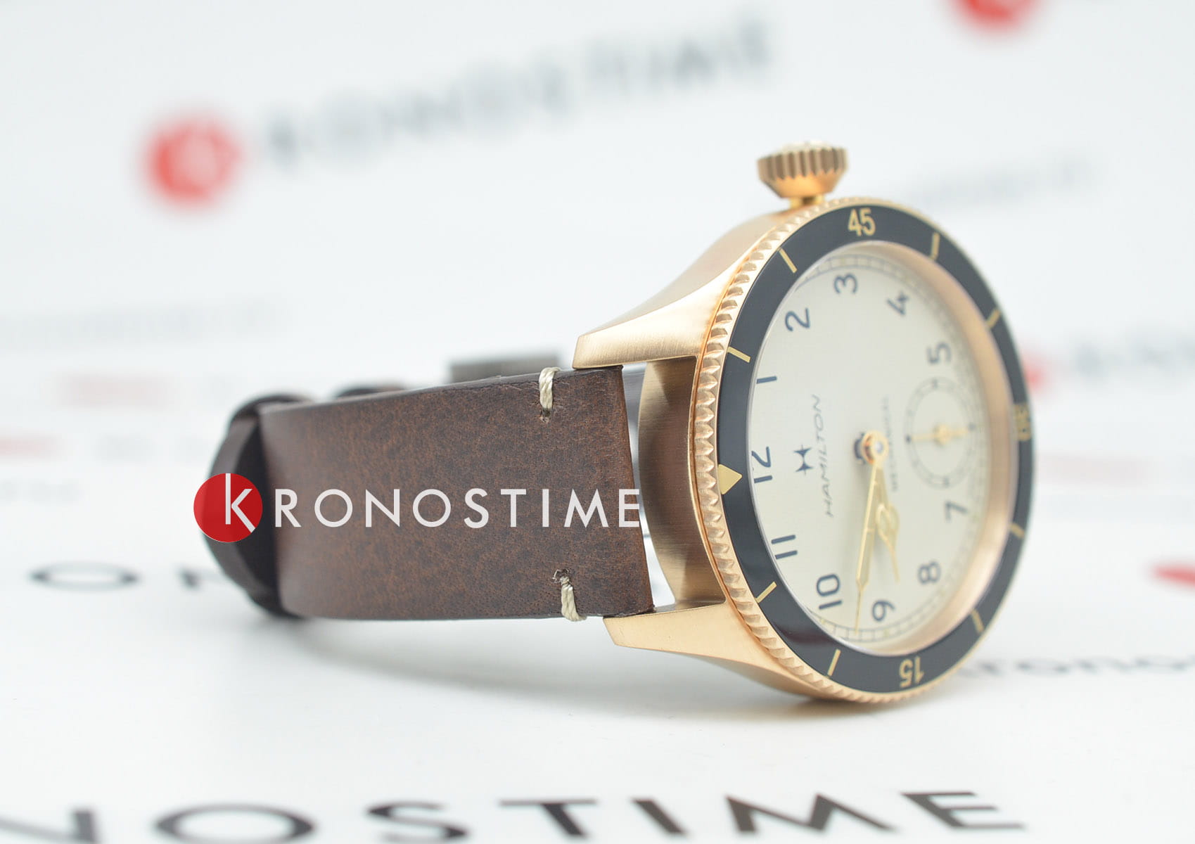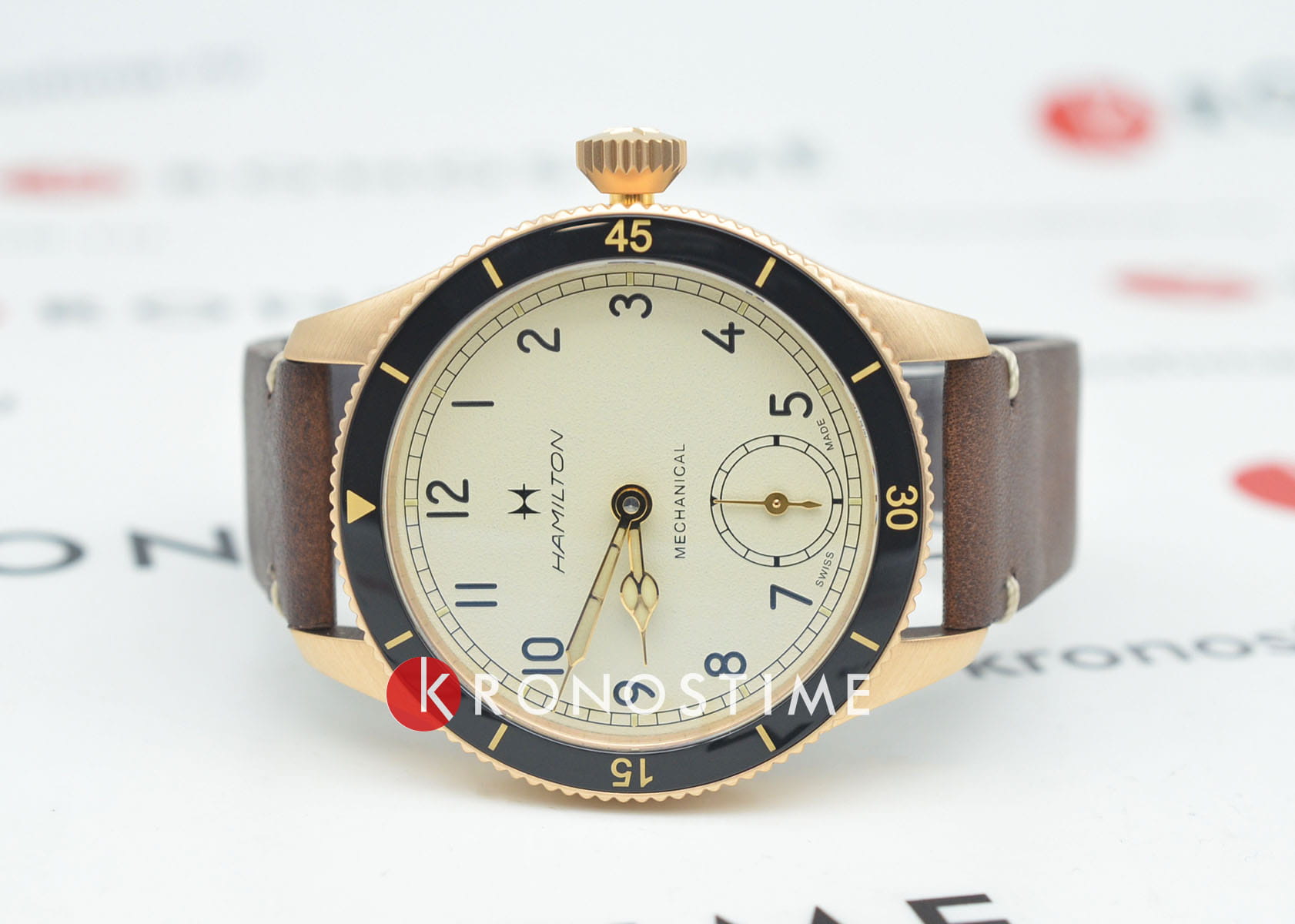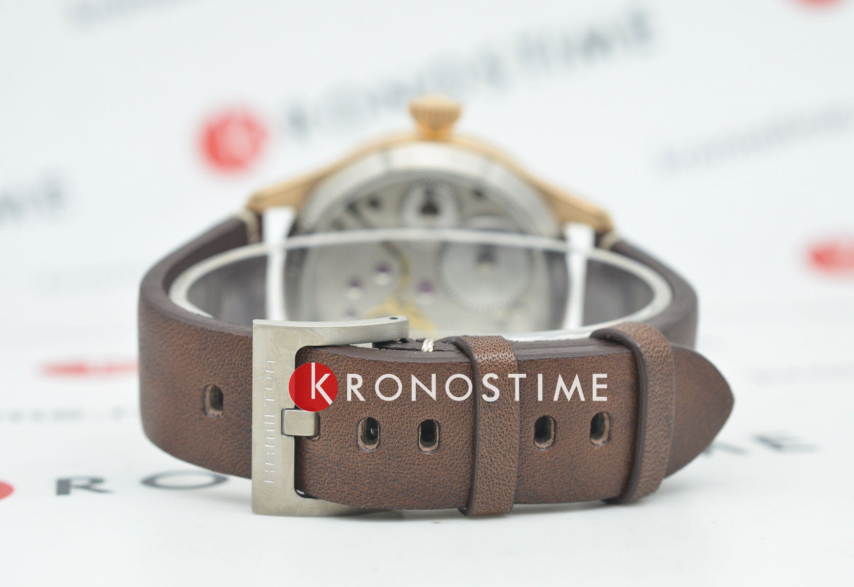Мужские стильные швейцарские часы Hamilton Khaki Aviation Pilot Pioneer Mechanical 43mm H76709510. Корпус из бронзы диаметром 43 мм с изысканным дизайном и увеличенной толщиной 13 мм подчеркивает элегантность модели, поворотный безельБезельВнешний ободок, закрепляющий стекло. В спортивных часах так называется поворотное кольцо с делениями на циферблате, выполняет роль таймера – замеряет отрезки времени на шкале. Неподвижный безель – элемент декора. Однонаправленно вращающийся безель на дайверских часах позволяет фиксировать моменты погружения и выныривания на поверхность. изготовлен из титана, а сапфировое стеклоСапфировое стеклоПрочный и надёжный материал из кристалла сапфира синтетического происхождения, характеризующийся особой твёрдостью и устойчивостью к царапинам и повреждениям. с антибликовым покрытиемАнтибликовое покрытиеСлой оксида металла в 0,13-0,3 микрон, благодаря которому стекло часов не бликует и не отражает свет. Антибликовое покрытие уменьшает отражение света в 10 раз, обеспечивая отличную читаемость показателей циферблата. обеспечивает превосходную читаемость лаконичного циферблата со стрелками с люминесцентным покрытиемЛюминесцентное покрытиеПозволяет считывать показания времени в темноте. Производители наносят на стрелки, часовые индексы, безель или поверхность циферблата светонакопительный состав, дающий холодное свечение. Super-LumiNova®. Механизм с ручным заводом ETA 6498-1, обеспечивающей запас хода 50 часов. Изысканный ремешок выполнен из кожи со стандартной застежкой, гарантирующей комфортное ношение и безопасность. Водонепроницаемость часов достигает 10 атмосфер (100 метров), делающая их подходящими для повседневного использования и активного отдыха. Это сочетание высокой прочности, точности и изысканного дизайна для уверенных в себе мужчин.