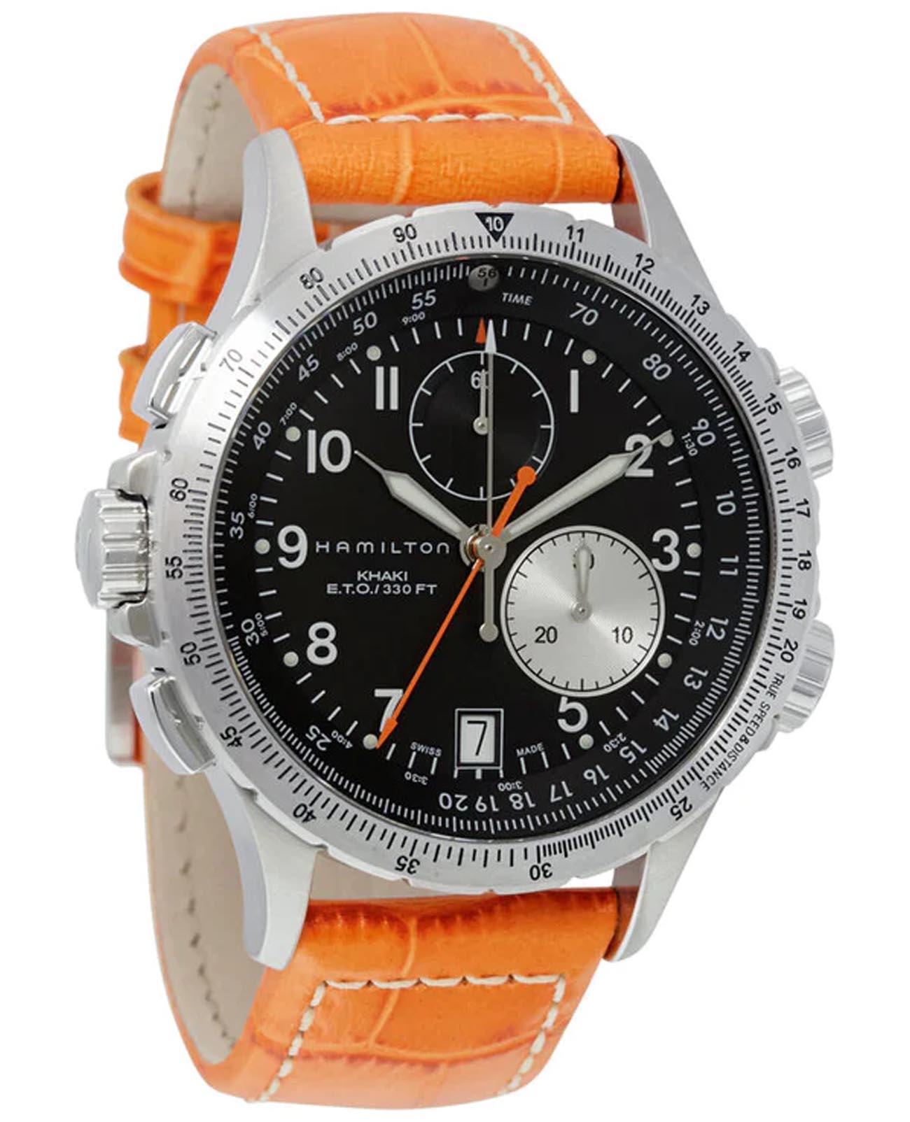 Мужские часы-хронографХронографФункция позволяет измерять отрезки времени с особой точностью: часы, минуты, секунды. Верным признаком хронографа является наличие на циферблате 3 дополнительных окошек-счётчиков. Hamilton Khaki Aviation ETO Chrono Quartz H77612933 с надёжным кварцевым механизмом. Корпус часов изготовлен из нержавеющей стали. Кожаный ремешок на стандартной застёжке. Сапфировое стеклоСапфировое стеклоПрочный и надёжный материал из кристалла сапфира синтетического происхождения, характеризующийся особой твёрдостью и устойчивостью к царапинам и повреждениям. с антибликовым покрытием. Второй часовой поясВторой часовой поясФункция, позволяющая отображать время двух часовых поясов одновременно., вычисление поправки на ветер, окошко даты находится в положении 6 часов. Стрелки и метки с люминесцентным покрытиемЛюминесцентное покрытиеПозволяет считывать показания времени в темноте. Производители наносят на стрелки, часовые индексы, безель или поверхность циферблата светонакопительный состав, дающий холодное свечение.. Уровень влагозащиты: 100 метров, позволит плавать, нырять и заниматься другими водными видами спорта.