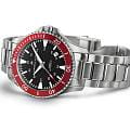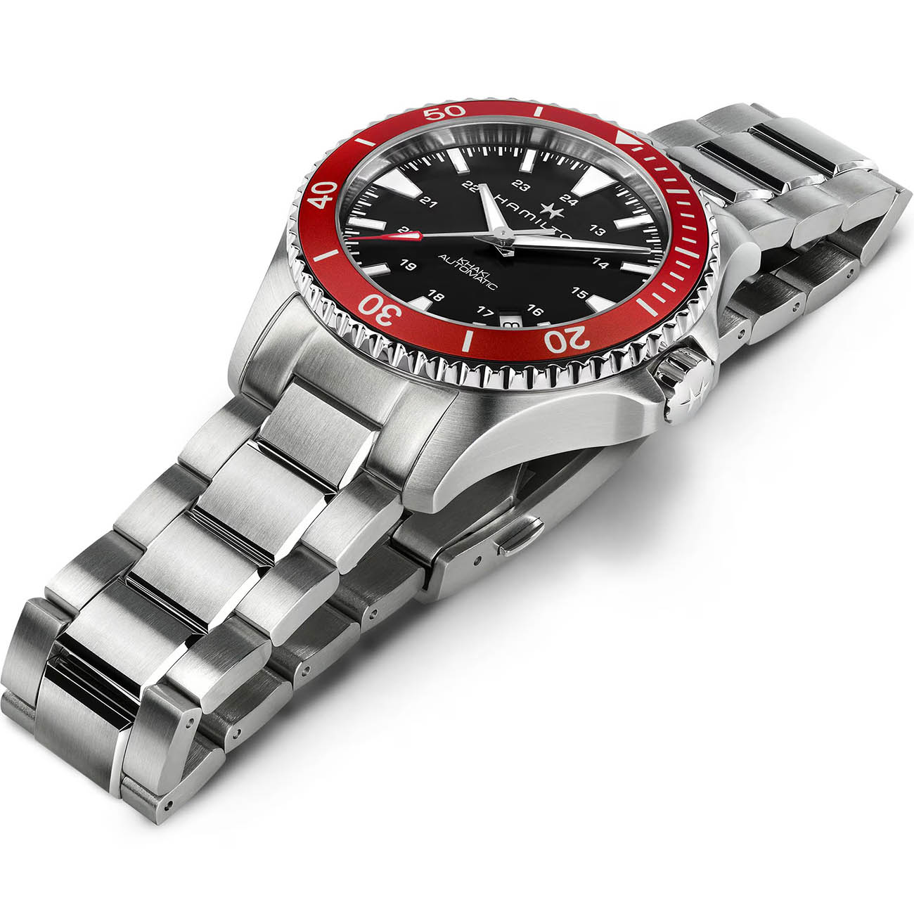Часы Hamilton Khaki Navy Scuba Automatic (H82405130) сочетают функциональность дайверских часов с ярким дизайном, заключены в 40-мм корпус из нержавеющей стали с красным алюминиевым безелемБезельВнешний ободок, закрепляющий стекло. В спортивных часах так называется поворотное кольцо с делениями на циферблате, выполняет роль таймера – замеряет отрезки времени на шкале. Неподвижный безель – элемент декора. Однонаправленно вращающийся безель на дайверских часах позволяет фиксировать моменты погружения и выныривания на поверхность., вдохновлённого морской тематикой. Модель оснащена автоматическим калибром H-10 с увеличенным запасом хода 80 часов и спиралью баланса Nivachron™Nivachron™Специально разработанный инновационный сплав Nivachron™ повышает устойчивость часов к воздействию магнитных полей., обеспечивающей устойчивость к магнитным полям и температурным перепадам. Чёрный циферблат с люминесцентными метками Super-LumiNova гарантирует чёткую видимость в темноте, а сапфировое стеклоСапфировое стеклоПрочный и надёжный материал из кристалла сапфира синтетического происхождения, характеризующийся особой твёрдостью и устойчивостью к царапинам и повреждениям. с антибликовым покрытиемАнтибликовое покрытиеСлой оксида металла в 0,13-0,3 микрон, благодаря которому стекло часов не бликует и не отражает свет. Антибликовое покрытие уменьшает отражение света в 10 раз, обеспечивая отличную читаемость показателей циферблата. защищает от царапин. Водонепроницаемость до 100 метров (10 бар) делает часы надёжным спутником для плавания. Комплектуется стальным браслетом шириной 20 мм с раскладной застёжкойРаскладная застёжкаТакой тип застёжки используется только на браслетах из металла. Она никогда не раскрывается полностью, происходит разделение на 2 и более частей. Раскладывающая застёжка снизит вероятность потери часов к минимуму., сочетающим комфорт и долговечность.