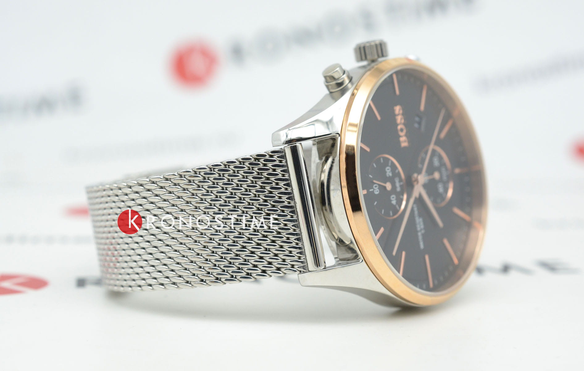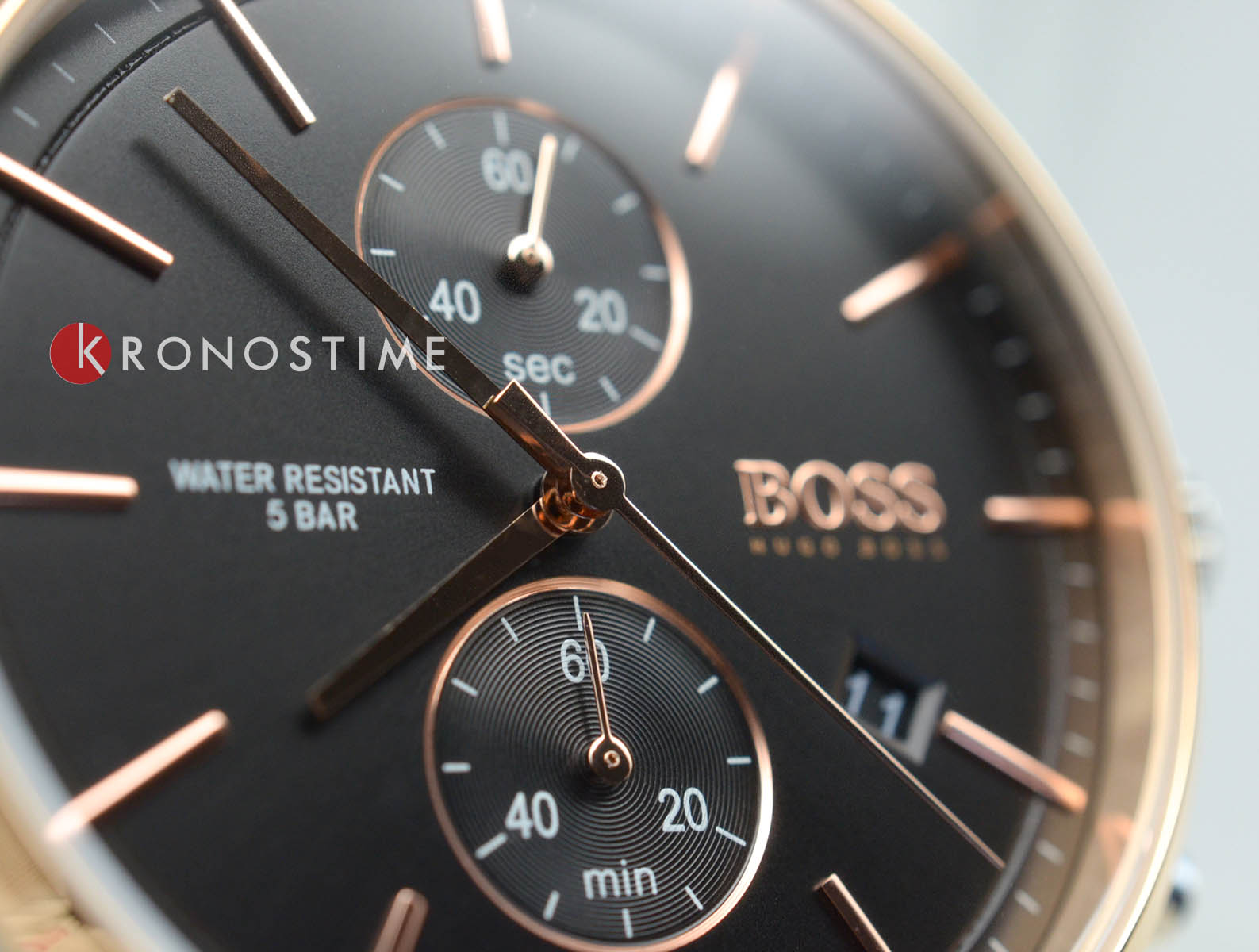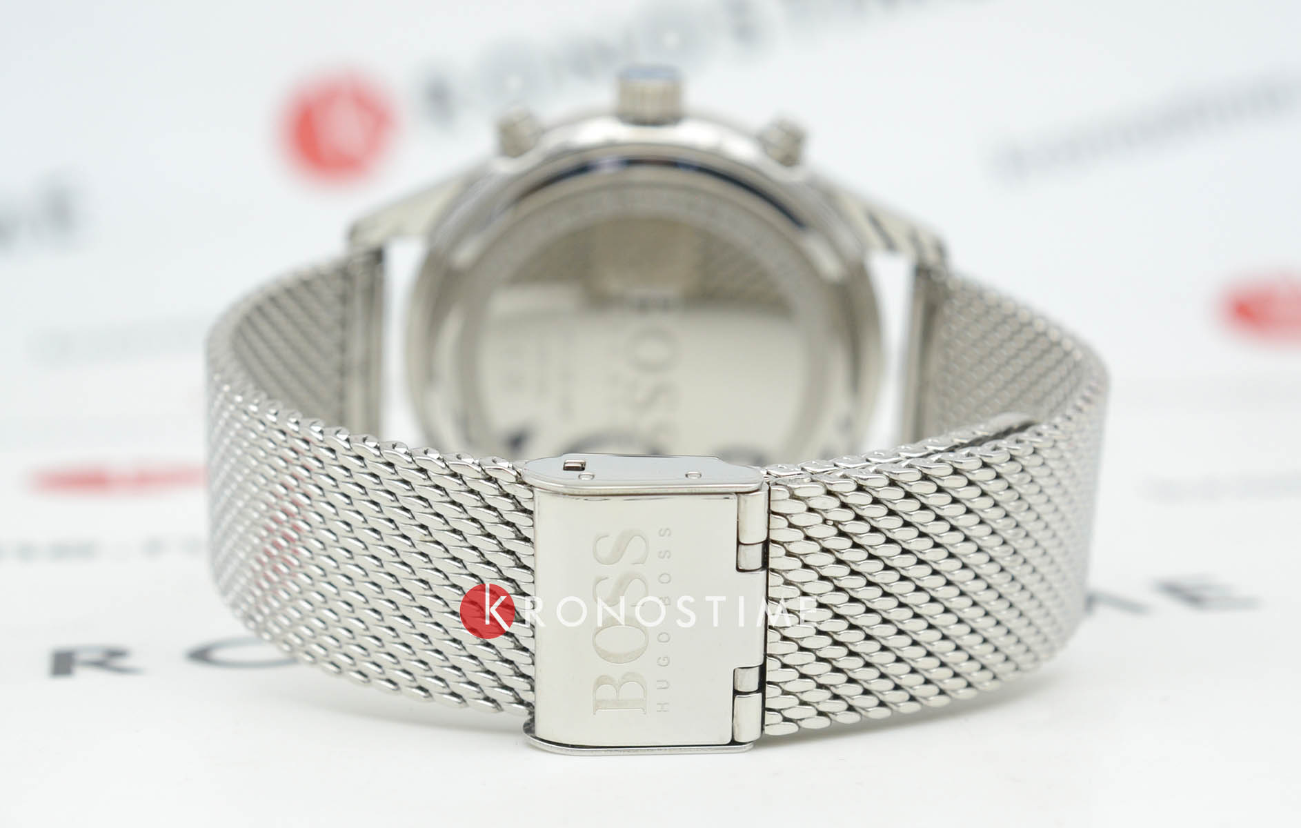 Мужские часы Hugo Boss Associate HB1513805 представлены в круглом 42-мм корпусе из нержавеющей стали с толщиной 9,9 мм. Оснащены кварцевым механизмом с функциями хронографаХронографФункция позволяет измерять отрезки времени с особой точностью: часы, минуты, секунды. Верным признаком хронографа является наличие на циферблате 3 дополнительных окошек-счётчиков., секундомеромСекундомерСекундоме́р — прибор, способный измерять интервалы времени с точностью до долей секунды. и индикацией даты на позиции 4 часа. Циферблат с подсветкой стрелок защищен устойчивым к царапинам минеральным стекломМинеральное стеклоМинеральное стекло представляет собой искусственно выращенный минерал кварца. Такое стекло отличается особой устойчивостью к повреждениям и царапинам. Уступает по некоторым качествам сапфировому стеклу.. Стальной браслет дополнен раскладной застёжкойРаскладная застёжкаТакой тип застёжки используется только на браслетах из металла. Она никогда не раскрывается полностью, происходит разделение на 2 и более частей. Раскладывающая застёжка снизит вероятность потери часов к минимуму. с фиксатором для надежной посадки. Водонепроницаемость 50 метров (5 ATM) обеспечивает защиту от брызг и дождя.