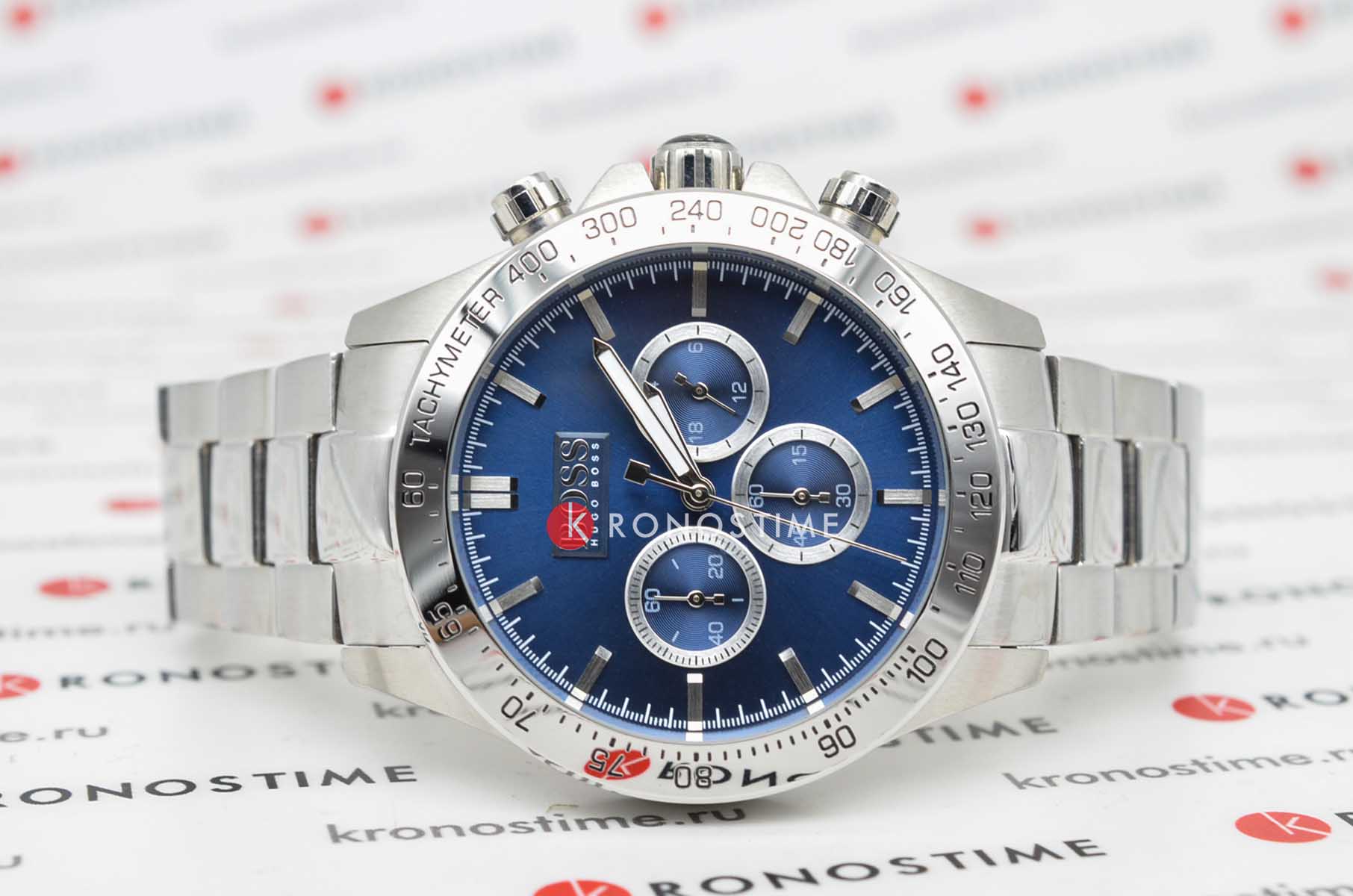 Мужские кварцевые часы Hugo Boss Ikon HB1512963 представляют собой стильный хронографХронографФункция позволяет измерять отрезки времени с особой точностью: часы, минуты, секунды. Верным признаком хронографа является наличие на циферблате 3 дополнительных окошек-счётчиков. с круглым корпусом диаметром 44 мм из нержавеющей стали, дополненным черным циферблатом с серебристыми стрелками и индексами. Модель оснащена высокоточным кварцевым механизмом с функцией хронографаХронографФункция позволяет измерять отрезки времени с особой точностью: часы, минуты, секунды. Верным признаком хронографа является наличие на циферблате 3 дополнительных окошек-счётчиков., включая 60-минутный счетчик и 24-часовой индикатор, а также тахиметрической шкалойТахиметрРазмеченная шкала, располагается на ободке или безеле часов. Тахиметр позволяет рассчитать скорость на определённом участке пути, расстояние измеряется в километрах или милях. на безэлеБезельВнешний ободок, закрепляющий стекло. В спортивных часах так называется поворотное кольцо с делениями на циферблате, выполняет роль таймера – замеряет отрезки времени на шкале. Неподвижный безель – элемент декора. Однонаправленно вращающийся безель на дайверских часах позволяет фиксировать моменты погружения и выныривания на поверхность. для расчетов скорости. Циферблат защищен устойчивым к царапинам минеральным стекломМинеральное стеклоМинеральное стекло представляет собой искусственно выращенный минерал кварца. Такое стекло отличается особой устойчивостью к повреждениям и царапинам. Уступает по некоторым качествам сапфировому стеклу., а водонепроницаемость 5 ATM (50 метров) обеспечивает защиту от брызг и дождя. Глубокий синий циферблат с люминесцентным покрытиемЛюминесцентное покрытиеПозволяет считывать показания времени в темноте. Производители наносят на стрелки, часовые индексы, безель или поверхность циферблата светонакопительный состав, дающий холодное свечение. на стрелках, обеспечивает отличную читаемость в любое время суток. Стальной браслет с раскладной застежкойРаскладная застёжкаТакой тип застёжки используется только на браслетах из металла. Она никогда не раскрывается полностью, происходит разделение на 2 и более частей. Раскладывающая застёжка снизит вероятность потери часов к минимуму. обеспечивает надежную посадку на запястье.