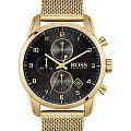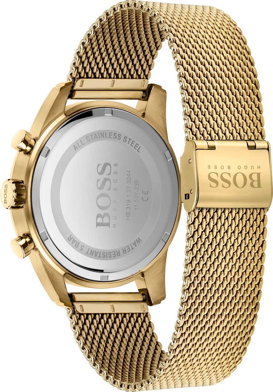 Мужские часы Hugo Boss Skymaster HB1513838 представлены в круглом 44-мм корпусе из нержавеющей стали 316L с золотистым IP-покрытиемIP-покрытиеМетод ионного напыления. Демонстрирует повышенную устойчивость к истиранию, окислению и химическим веществам. Под воздействием высокого давления и температуры около 1500°C молекулы металла надёжно соединяются с частицами корпуса часов. толщиной 10 мм. Оснащены кварцевым механизмом с функцией хронографаХронографФункция позволяет измерять отрезки времени с особой точностью: часы, минуты, секунды. Верным признаком хронографа является наличие на циферблате 3 дополнительных окошек-счётчиков. и секундомераСекундомерСекундоме́р — прибор, способный измерять интервалы времени с точностью до долей секунды.. Черный циферблат с арабскими цифрами защищен устойчивым к царапинам минеральным стекломМинеральное стеклоМинеральное стекло представляет собой искусственно выращенный минерал кварца. Такое стекло отличается особой устойчивостью к повреждениям и царапинам. Уступает по некоторым качествам сапфировому стеклу.. Стальной браслет с миланским плетением и с IP-покрытиемIP-покрытиеМетод ионного напыления. Демонстрирует повышенную устойчивость к истиранию, окислению и химическим веществам. Под воздействием высокого давления и температуры около 1500°C молекулы металла надёжно соединяются с частицами корпуса часов. дополнен раскладной застёжкойРаскладная застёжкаТакой тип застёжки используется только на браслетах из металла. Она никогда не раскрывается полностью, происходит разделение на 2 и более частей. Раскладывающая застёжка снизит вероятность потери часов к минимуму.. Водонепроницаемость 50 метров (5 ATM) обеспечивает защиту от брызг воды.