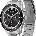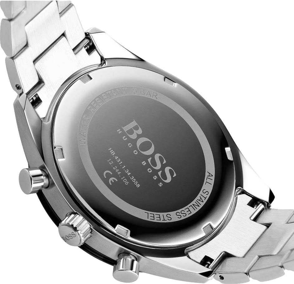 Мужские часы Hugo Boss HB1513862 коллекции Santiago представлены в круглом 44-мм корпусе из нержавеющей стали 316L с IP-покрытиемIP-покрытиеМетод ионного напыления. Демонстрирует повышенную устойчивость к истиранию, окислению и химическим веществам. Под воздействием высокого давления и температуры около 1500°C молекулы металла надёжно соединяются с частицами корпуса часов.. Оснащены кварцевым механизмом с функциями хронографаХронографФункция позволяет измерять отрезки времени с особой точностью: часы, минуты, секунды. Верным признаком хронографа является наличие на циферблате 3 дополнительных окошек-счётчиков., секундомеромСекундомерСекундоме́р — прибор, способный измерять интервалы времени с точностью до долей секунды. и тахиметрической шкалойТахиметрРазмеченная шкала, располагается на ободке или безеле часов. Тахиметр позволяет рассчитать скорость на определённом участке пути, расстояние измеряется в километрах или милях., а также индикацией даты. Черный циферблат с метками в виде штрихов защищен устойчивым к царапинам минеральным стекломМинеральное стеклоМинеральное стекло представляет собой искусственно выращенный минерал кварца. Такое стекло отличается особой устойчивостью к повреждениям и царапинам. Уступает по некоторым качествам сапфировому стеклу.. Браслет из стали 316L дополнен раскладной застёжкойРаскладная застёжкаТакой тип застёжки используется только на браслетах из металла. Она никогда не раскрывается полностью, происходит разделение на 2 и более частей. Раскладывающая застёжка снизит вероятность потери часов к минимуму.. Водонепроницаемость 50 метров (5 ATM) обеспечивает защиту от брызг и дождя.