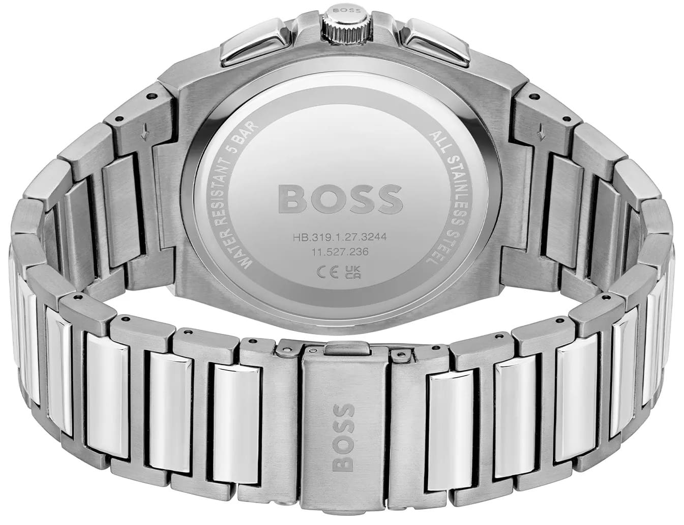 Мужские часы Hugo Boss Steer HB1514048 представлены в круглом 45,8-мм корпусе из нержавеющей стали. Оснащены кварцевым механизмом с функциями хронографаХронографФункция позволяет измерять отрезки времени с особой точностью: часы, минуты, секунды. Верным признаком хронографа является наличие на циферблате 3 дополнительных окошек-счётчиков. и секундомеромСекундомерСекундоме́р — прибор, способный измерять интервалы времени с точностью до долей секунды.. Синий циферблат защищен устойчивым к царапинам минеральным стекломМинеральное стеклоМинеральное стекло представляет собой искусственно выращенный минерал кварца. Такое стекло отличается особой устойчивостью к повреждениям и царапинам. Уступает по некоторым качествам сапфировому стеклу.. Браслет из нержавеющей стали дополнен раскладной застёжкойРаскладная застёжкаТакой тип застёжки используется только на браслетах из металла. Она никогда не раскрывается полностью, происходит разделение на 2 и более частей. Раскладывающая застёжка снизит вероятность потери часов к минимуму.. Водонепроницаемость 50 метров (5 ATM) позволяет использовать часы для плавания.