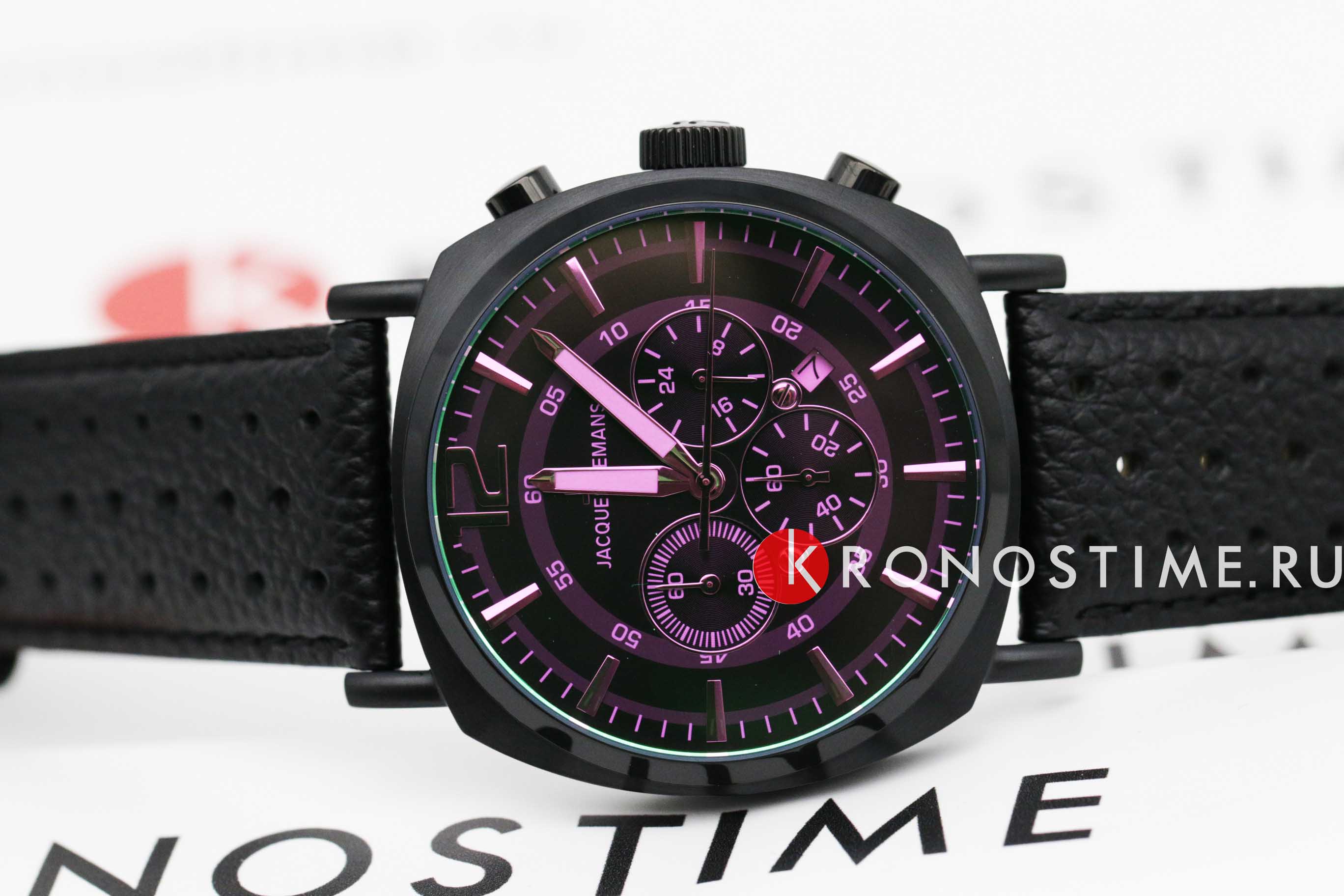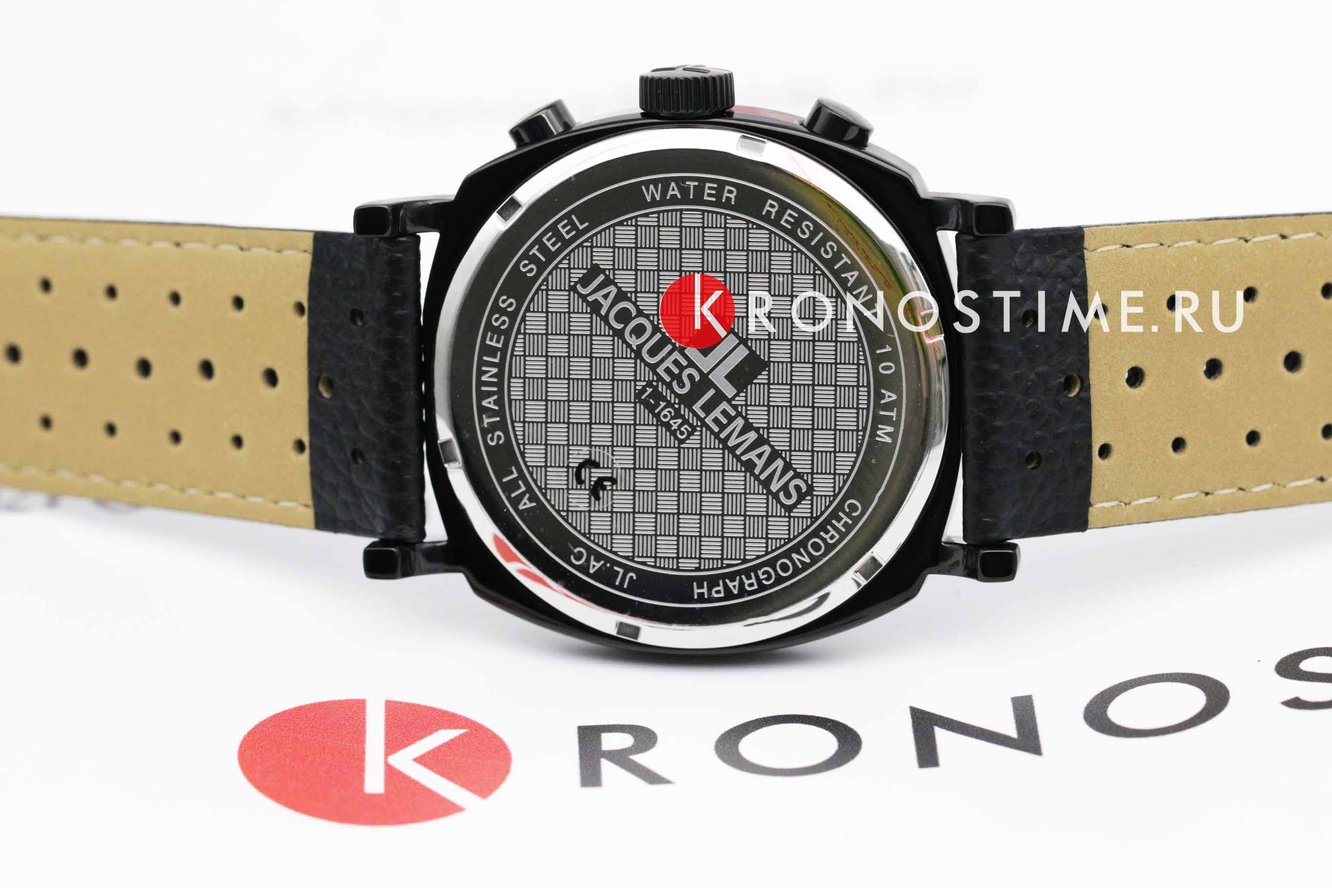 Мужские наручные часы c хронографомХронографФункция позволяет измерять отрезки времени с особой точностью: часы, минуты, секунды. Верным признаком хронографа является наличие на циферблате 3 дополнительных окошек-счётчиков. Jacques Lemans Sport 1-1645N, кварцевый механизм с высокой точностью. Класс водозащиты: 100 метров, позволит плавать, нырять и заниматься другими водными видами спорта. Корпус часов изготовлен из стали с PVD-покрытиемPVDУльтратонкое покрытие наносится в технике вакуумного напыления, сочетает в себе нитрид титана особой прочности со слоем золота или оксида хрома. Несёт в себе декоративную или защитную функцию.. На широком черном циферблате с полировкой в виде солнечных лучей размещены индикатор 24-х часов, минутный и секундный накопители, окошко даты. Хорошо читаемые стрелки часов и минут с люминесцентным покрытиемЛюминесцентное покрытиеПозволяет считывать показания времени в темноте. Производители наносят на стрелки, часовые индексы, безель или поверхность циферблата светонакопительный состав, дающий холодное свечение., что позволяет легко определить время даже в темноте. В модели установлено ударопрочное минеральное стеклоМинеральное стеклоМинеральное стекло представляет собой искусственно выращенный минерал кварца. Такое стекло отличается особой устойчивостью к повреждениям и царапинам. Уступает по некоторым качествам сапфировому стеклу.-хамелеон Crystex. Завинчивающаяся задняя крышка помогает обеспечить повышенную водостойкость 10 атмосфер. Ремешок черного цвета из натуральной кожи с перфорацией подчеркивает спортивный характер модели, а прошивка продлевает срок его службы.