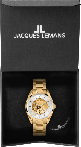 Мужские австрийские часы Jacques Lemans Automatic 1-2087J, механический механизм (автоматический калибр) с высокой точностью. Класс водозащиты: 50 метров, позволит защитить корпус от случайных брызг или капель дождя. Корпус часов изготовлен из стали, золотистого цвета.