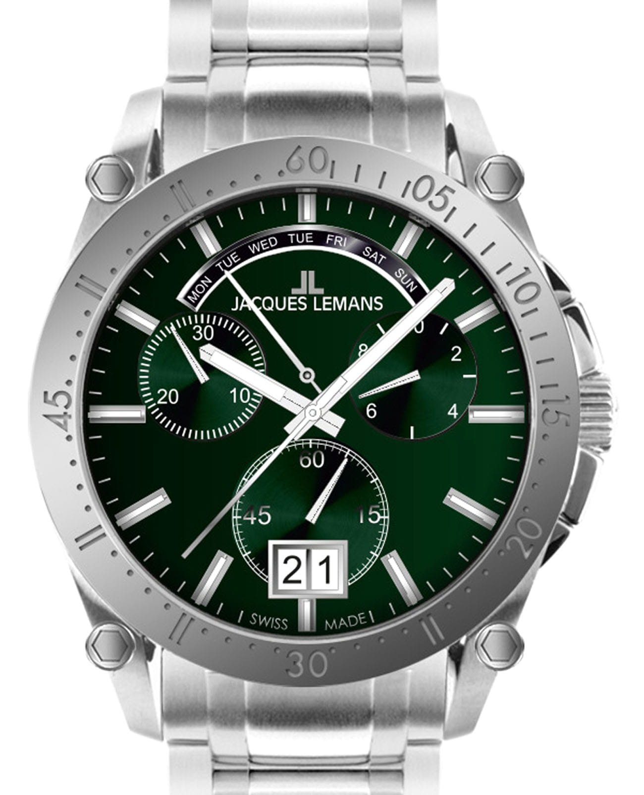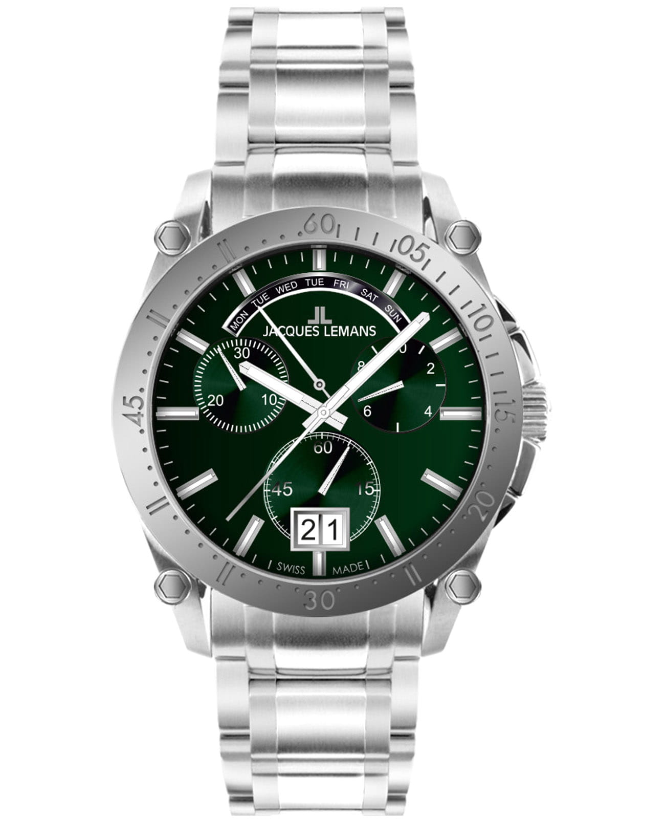 Мужские часы-хронографХронографФункция позволяет измерять отрезки времени с особой точностью: часы, минуты, секунды. Верным признаком хронографа является наличие на циферблате 3 дополнительных окошек-счётчиков. Jacques Lemans 1-2198F – лаконичная красота и изысканная элегантность. Оригинальная модель с классическим оформлением станет превосходным завершением образа, наделив его индивидуальным характером. Корпус выполнен из нержавеющей стали, диаметром 44 мм, что обеспечивает долговечность и утончённый внешний вид. Ударопрочное минеральное стеклоМинеральное стеклоМинеральное стекло представляет собой искусственно выращенный минерал кварца. Такое стекло отличается особой устойчивостью к повреждениям и царапинам. Уступает по некоторым качествам сапфировому стеклу. с сапфировым напылением защищает циферблат от царапин. Стальной браслет на раскладной застёжкеРаскладная застёжкаТакой тип застёжки используется только на браслетах из металла. Она никогда не раскрывается полностью, происходит разделение на 2 и более частей. Раскладывающая застёжка снизит вероятность потери часов к минимуму. обеспечивает комфортное ношение. Водозащита 100 метров позволит плавать, нырять и заниматься другими водными видами спорта. Стрелки и метки с люминесцентным покрытиемЛюминесцентное покрытиеПозволяет считывать показания времени в темноте. Производители наносят на стрелки, часовые индексы, безель или поверхность циферблата светонакопительный состав, дающий холодное свечение. позволяющие легко определять время даже в темноте. Окошко даты находится в положении 6 часов. Широкое окошко дня недели в положении 12 часов позволяет показывать название дня недели. Это аксессуар для мужчины, который ценит классический стиль и функциональность.